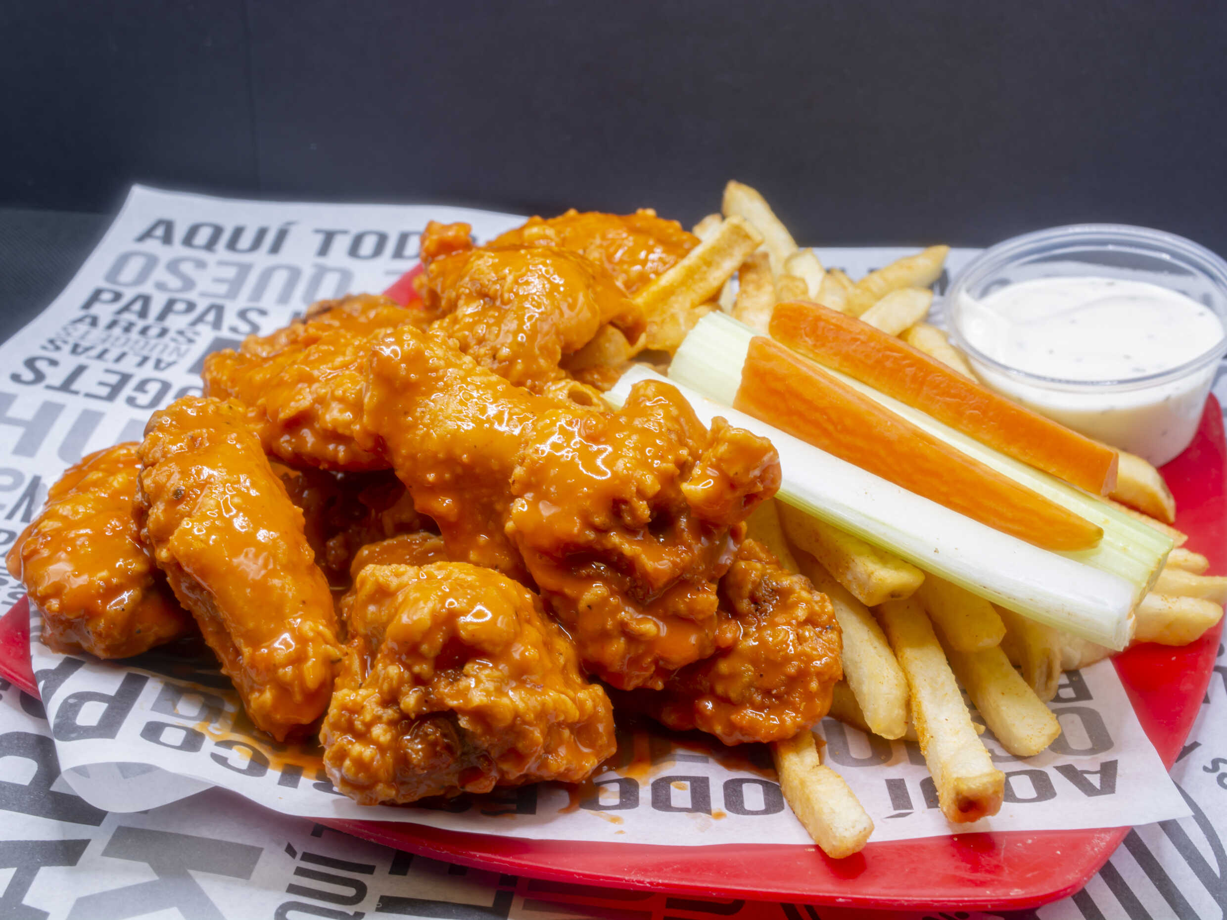 A la medida de tu antojo, BBQ o Búfalo, verdura, ranch.