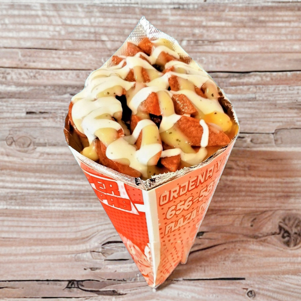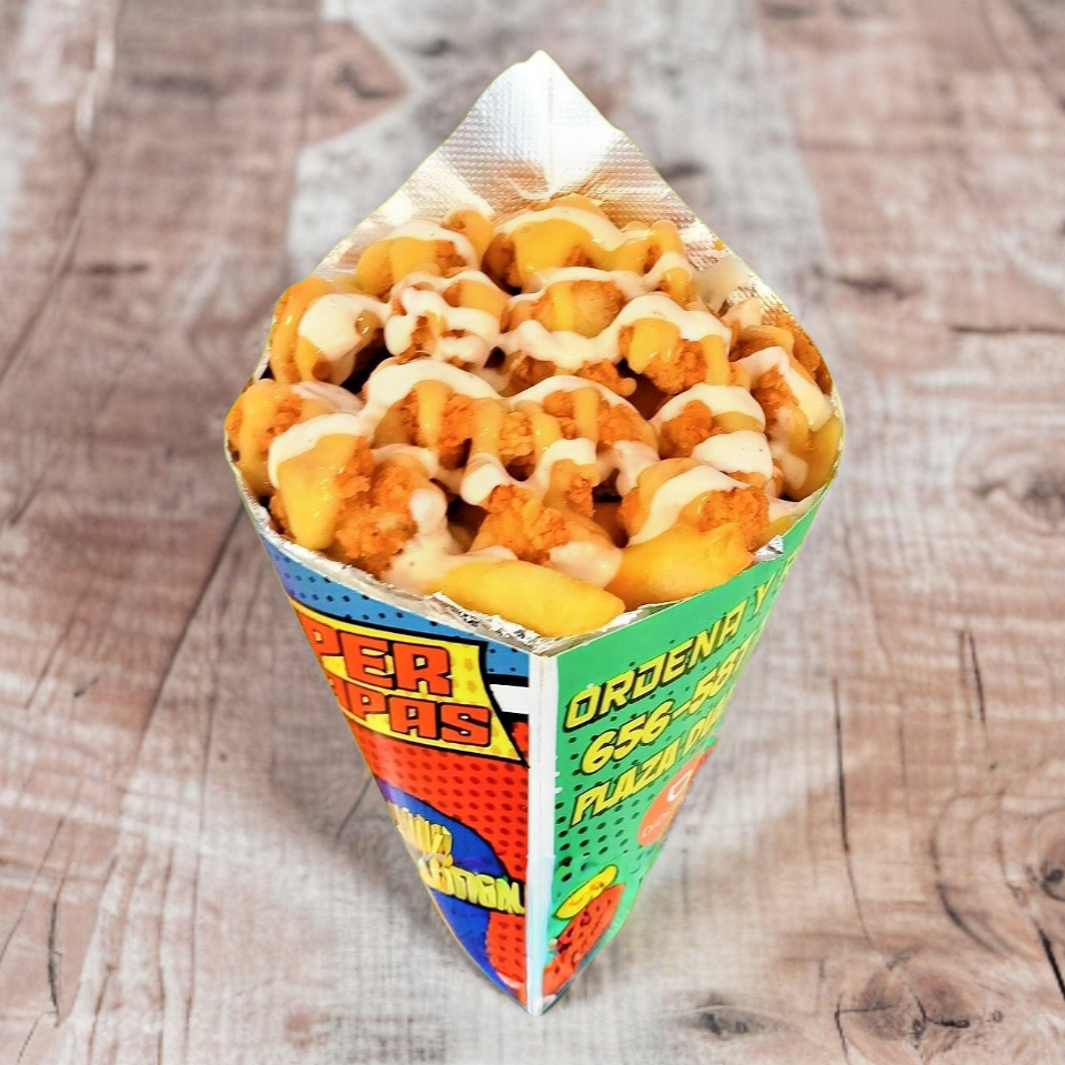 Cono mediano de papas fritas con el queso de su preferencia, tres porciones de los ingredientes que seleccione (iguales o diferentes), uno en medio y los otros dos en la parte superior del cono y a elegir su salsa favorita.