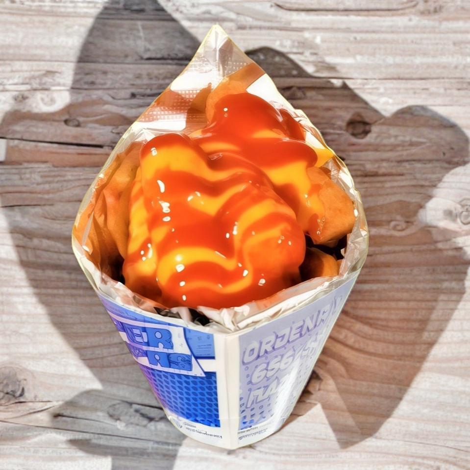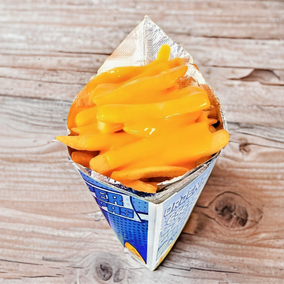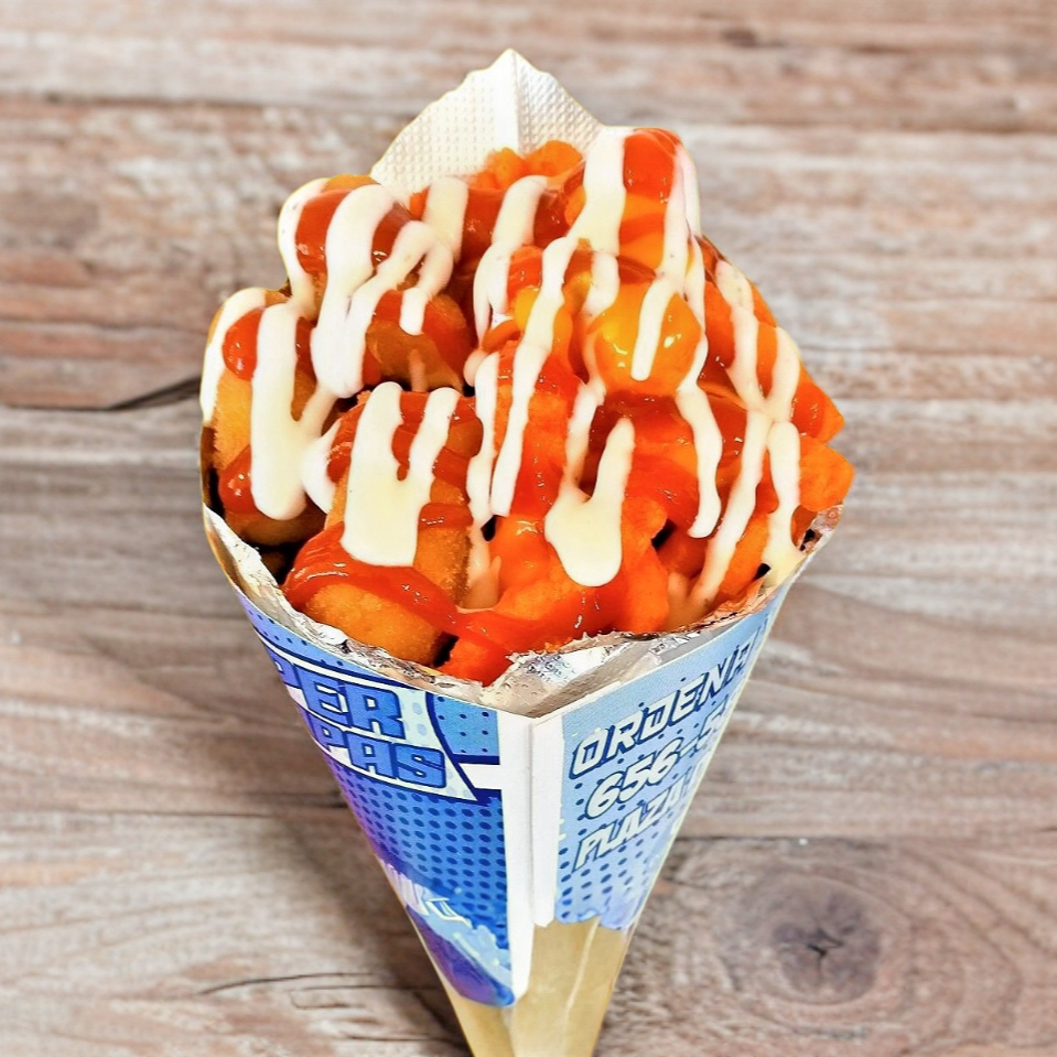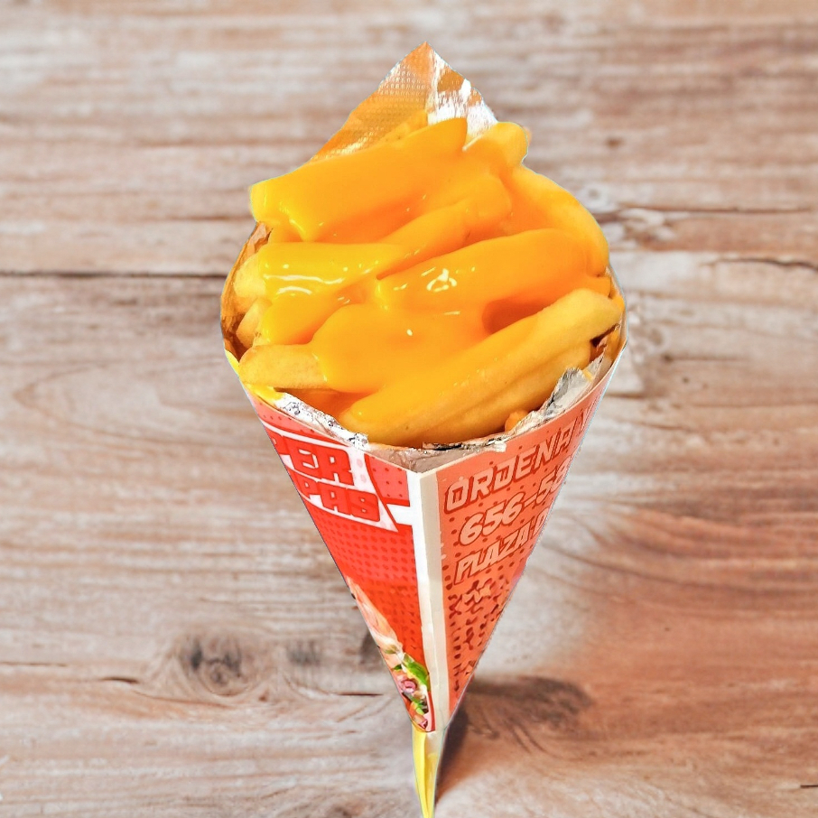 Cono mediano de papas fritas (sin ingredientes), con el queso de su preferencia y a elegir su salsa favorita.