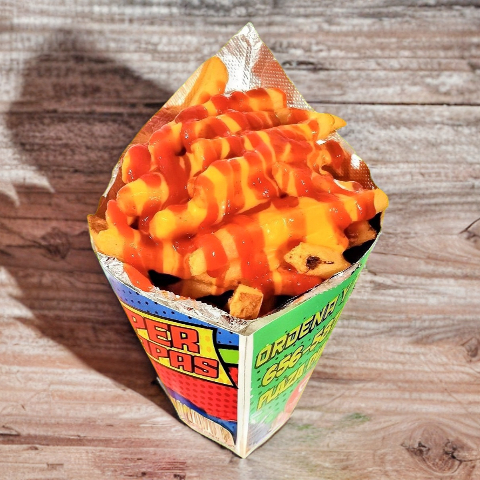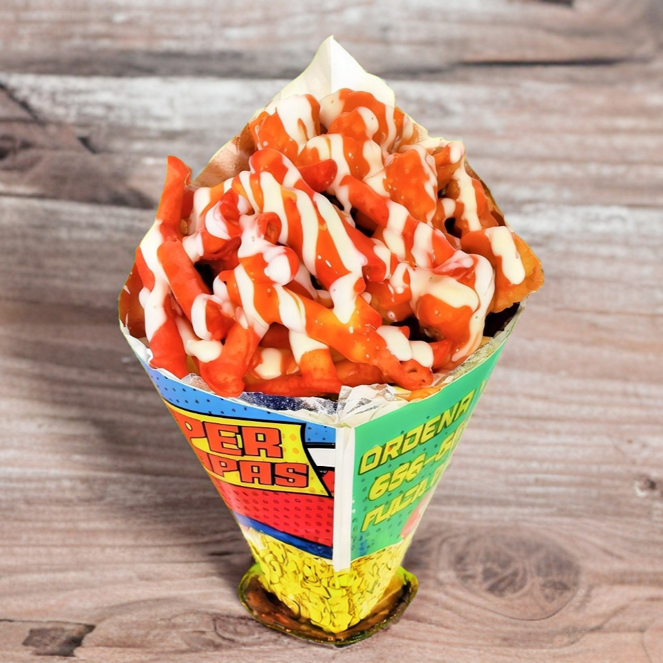 Cono jumbo de papas fritas (sin ingredientes), con el queso de su preferencia y a elegir 3 de sus salsas favoritas.