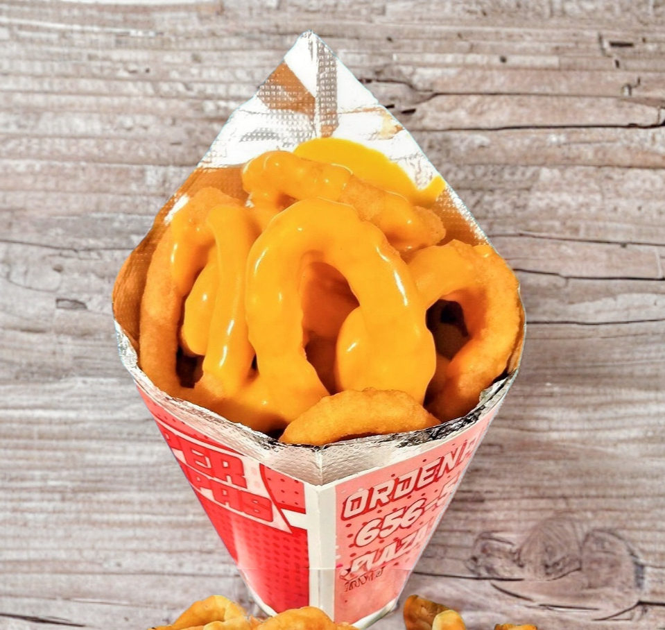 Cono jumbo de papas fritas con el queso de su preferencia, una porción del ingrediente que seleccione en la parte superior del cono y a elegir 3 de sus salsas favoritas.