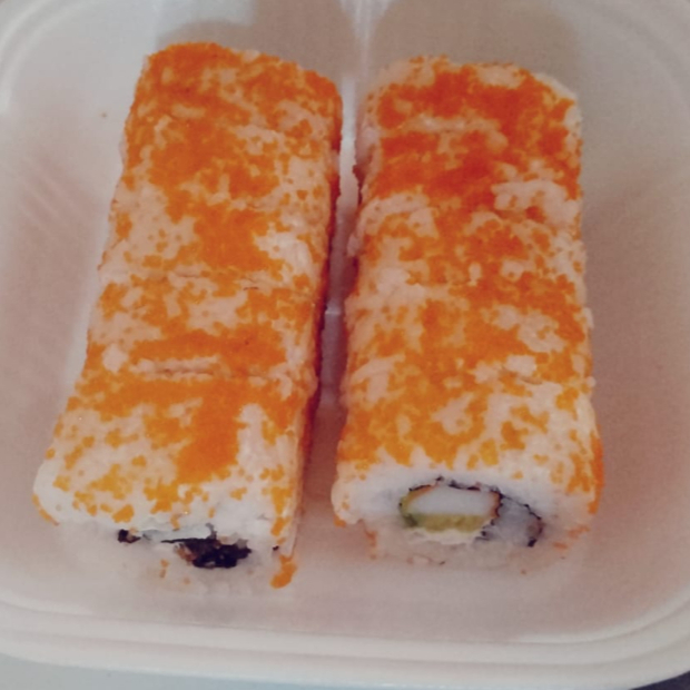 Por dentro: aguacate ,queso y surimi, Por fuera :Masago y anguila