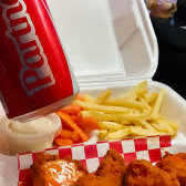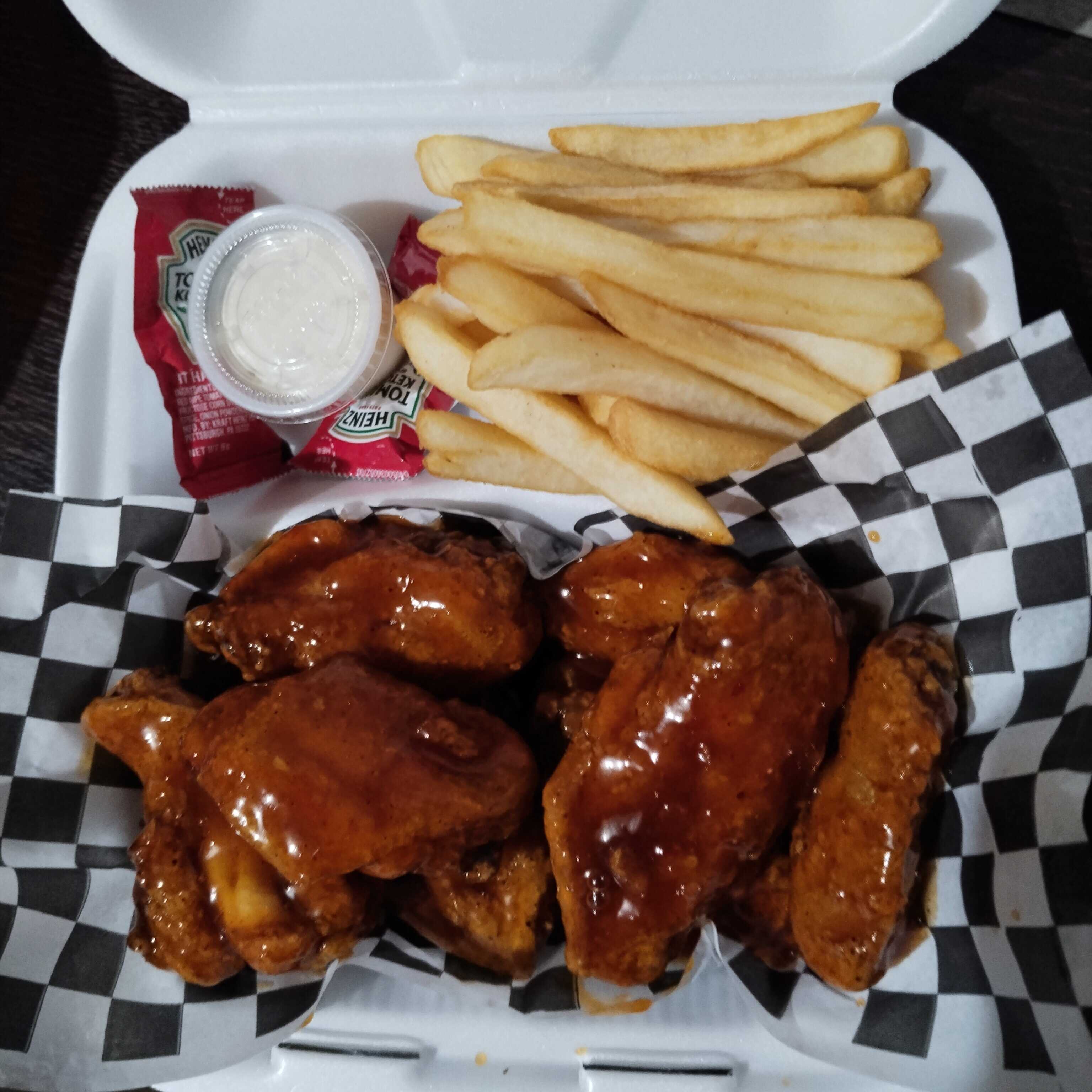 6 piezas de alitas en salsa bbq, papas y ranch y cápsu