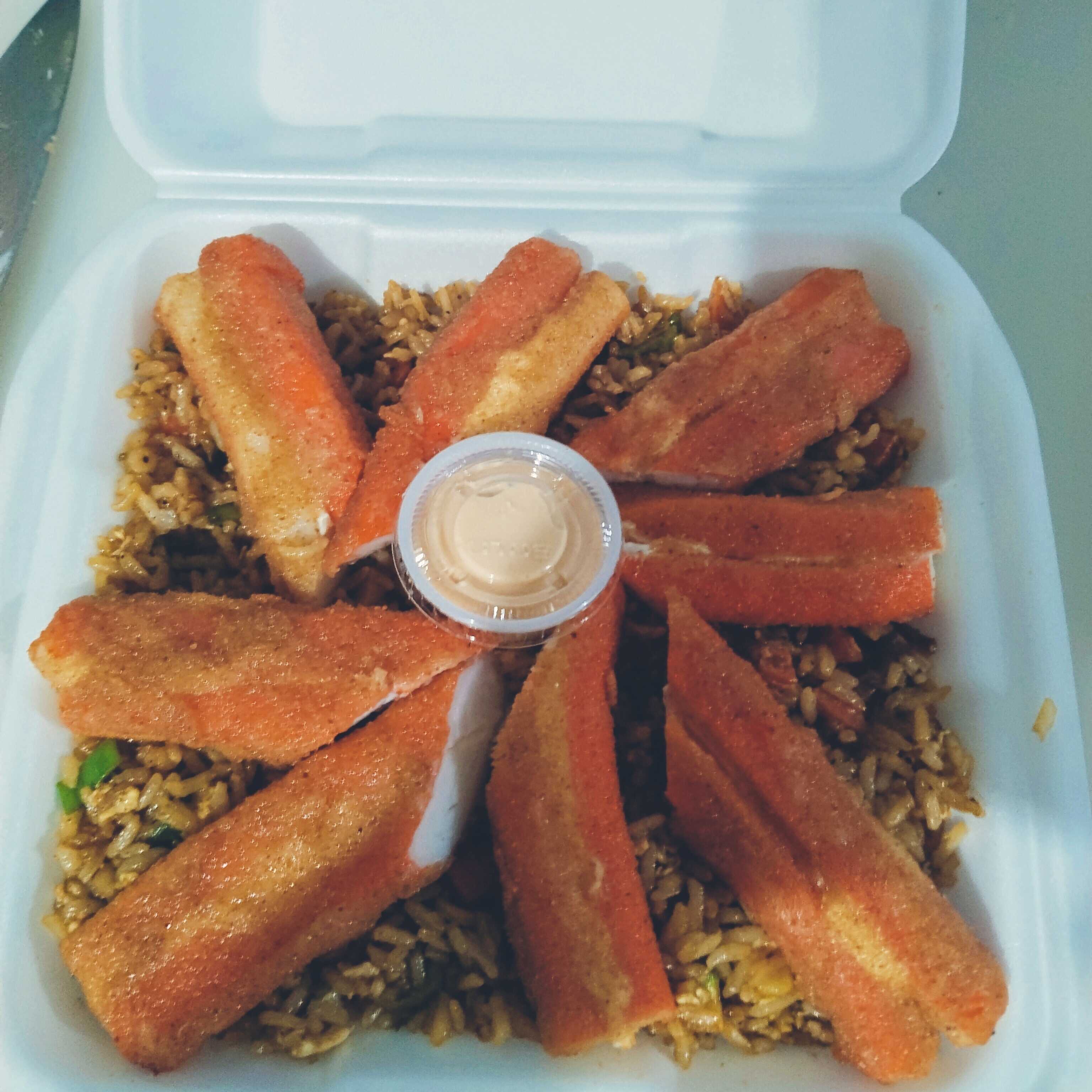 7 piezas de cangrejo rellenas de queso sobre una cama de yakimeshi con salsa tártara