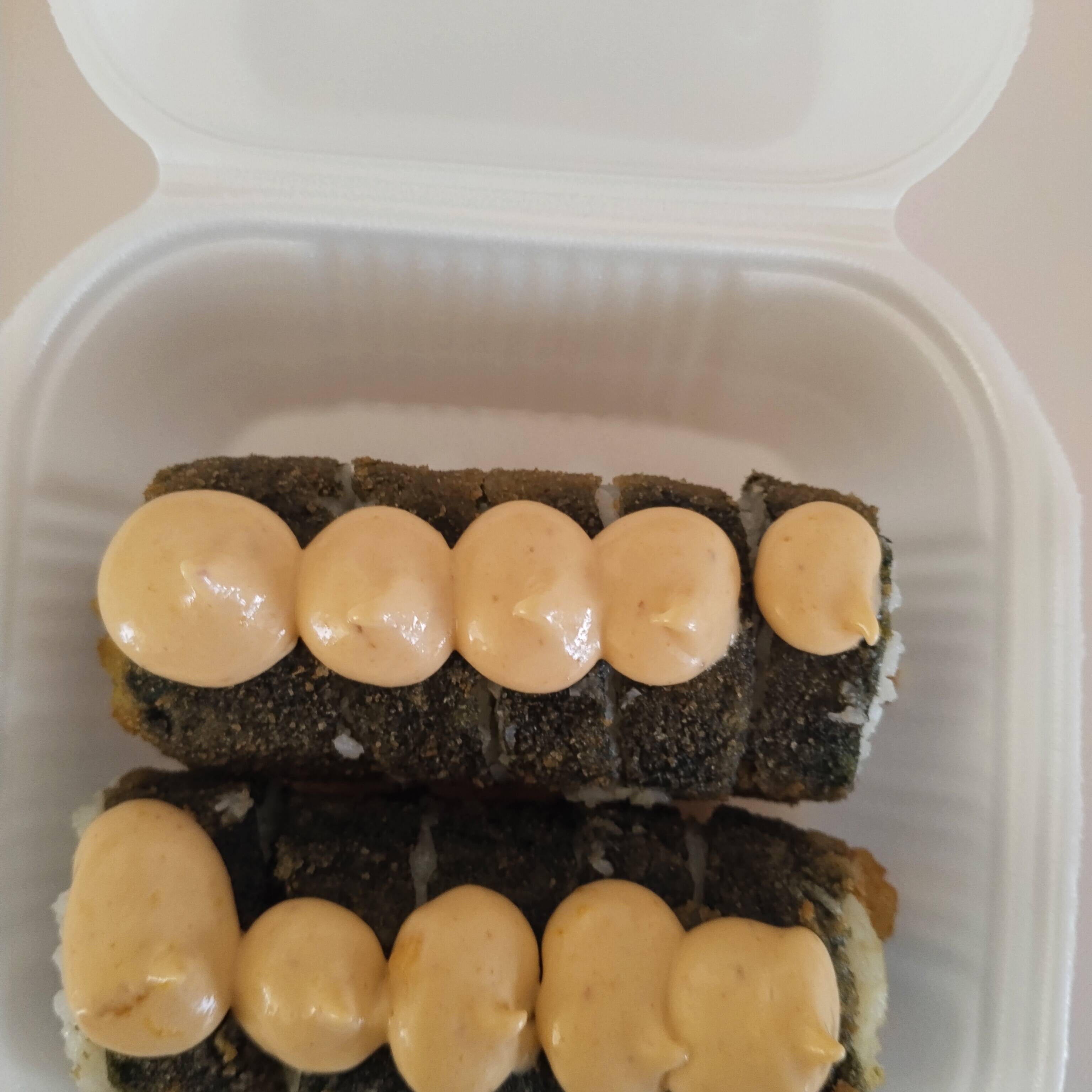 Por fuera: alga marina, por dentro : aguacate, queso crema, surimi empanizado y toreados. Bañado con salsa sirasha y salsa de anguila
