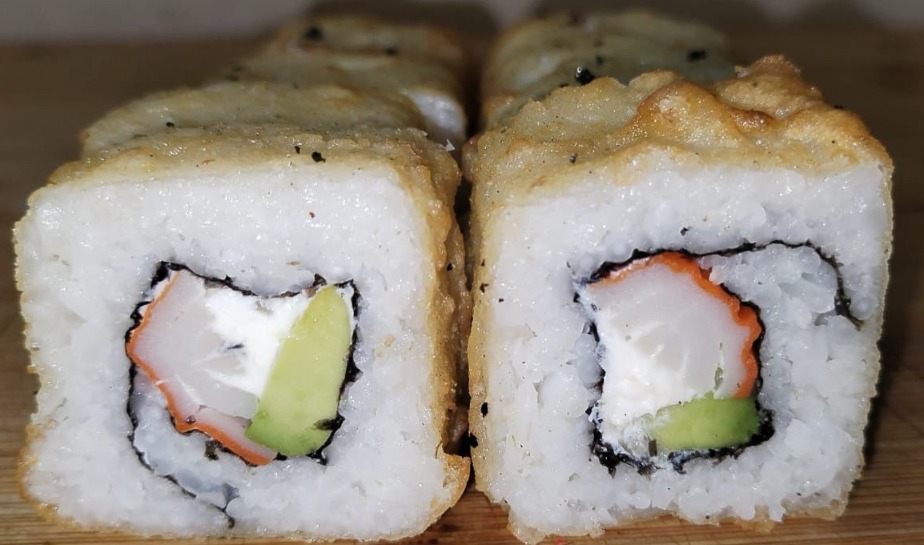 Aguacate, queso manchego y surimi, cubierto con plátano macho y philadelphia, bañado en lechera. (Rollo capeado).