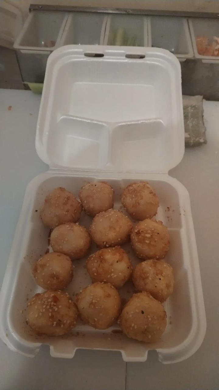 10 Bolas de arroz Capeadas Rellenas de Cangrejo y Philadelphia, Bañadas en Salsa de Anguila y Ajonjolí.