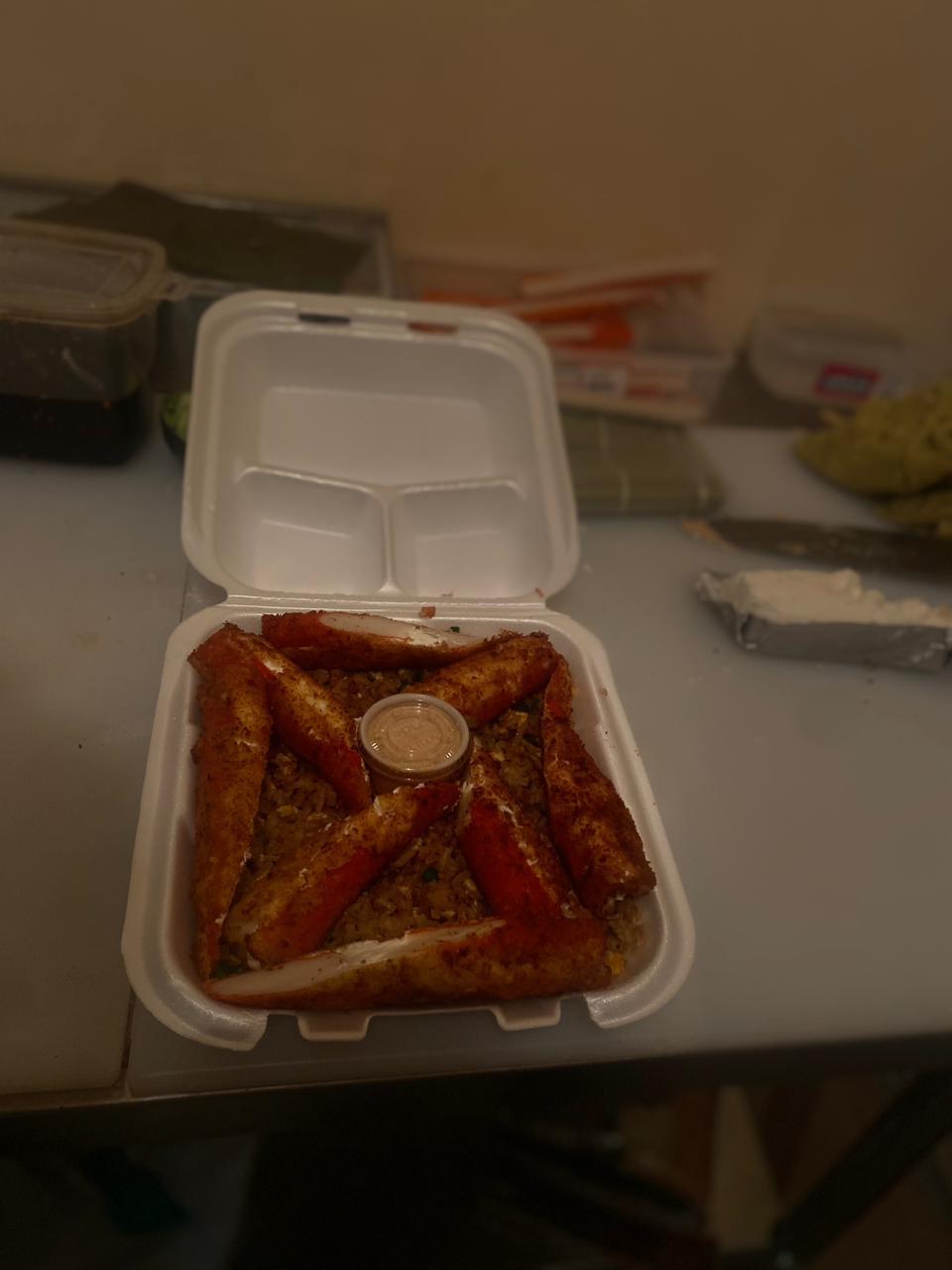 8 piezas de cangrejo rellenos de queso sobre una cama de yakimechi.