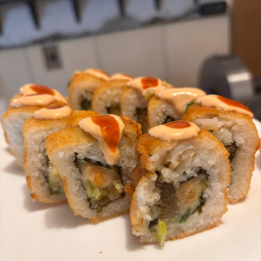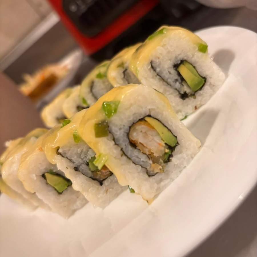 Philadelphia, Aguacate, Camarón Empanizado, Salmón. Surimi y Chiles Toreados, Bañada en Salsa de Anguila y Tártara.