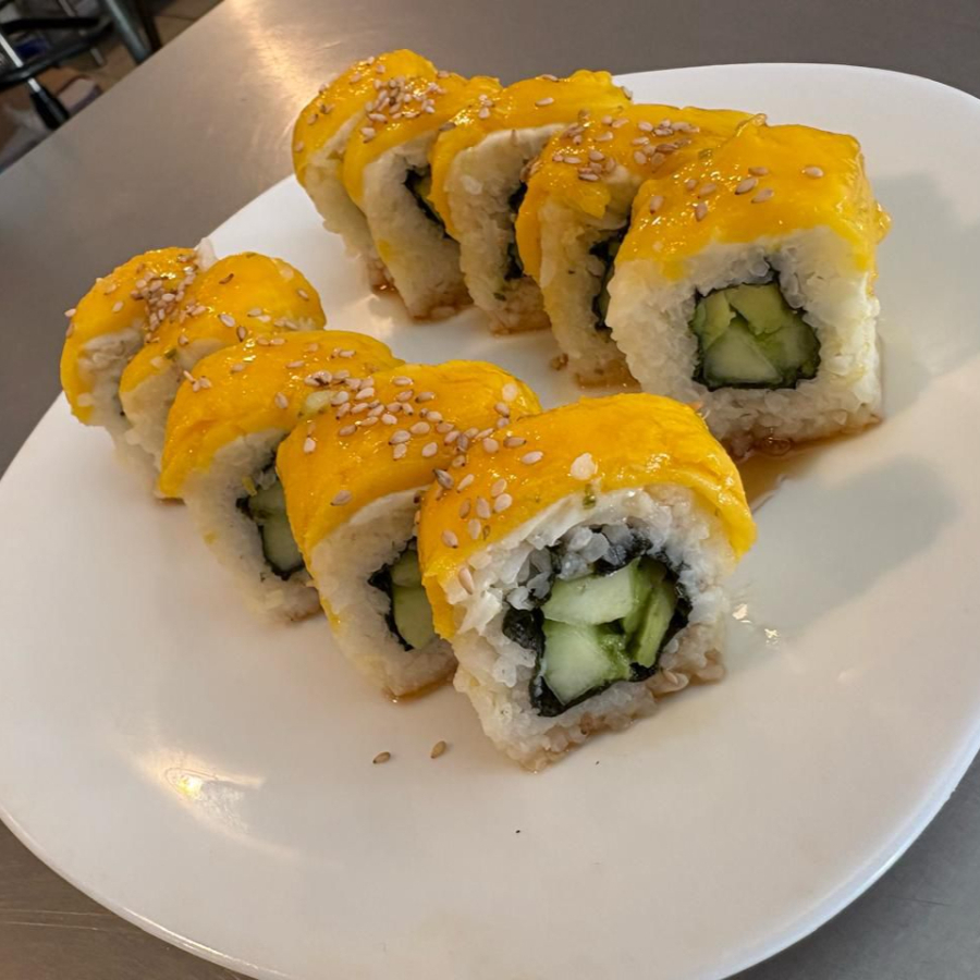 Aguacate y Pepino, Cubierto de Philadelphia y Mango, Bañado en Salsa de Anguila y Ajonjoli.