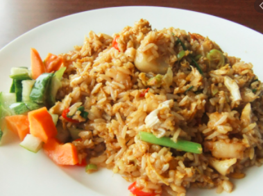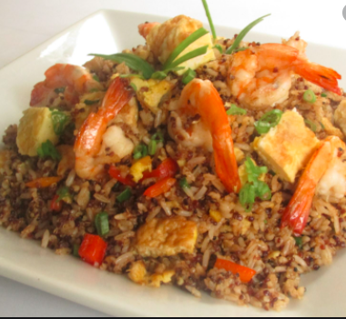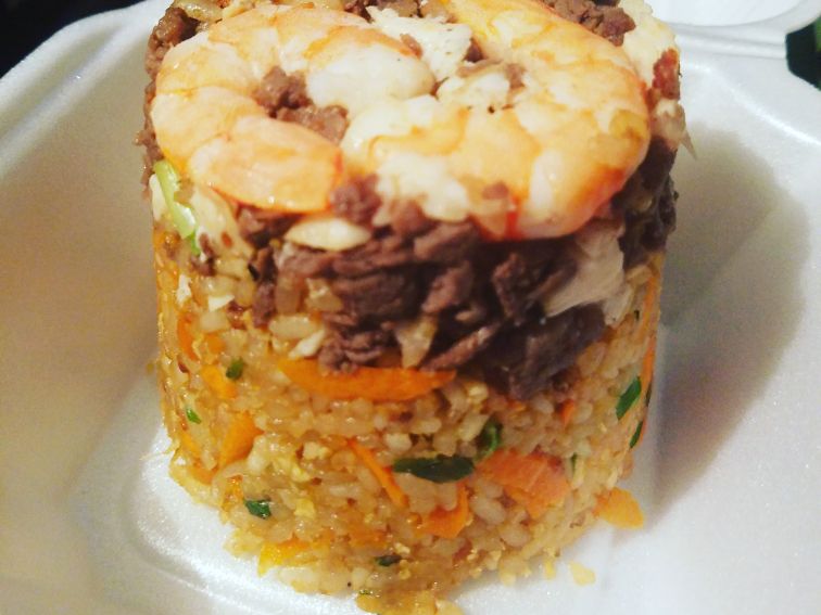 Arroz salteado en soya, zanahoria, cebollín,camarón,pollo,filete de res