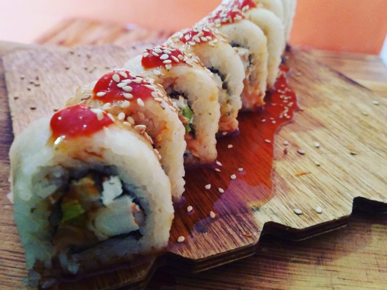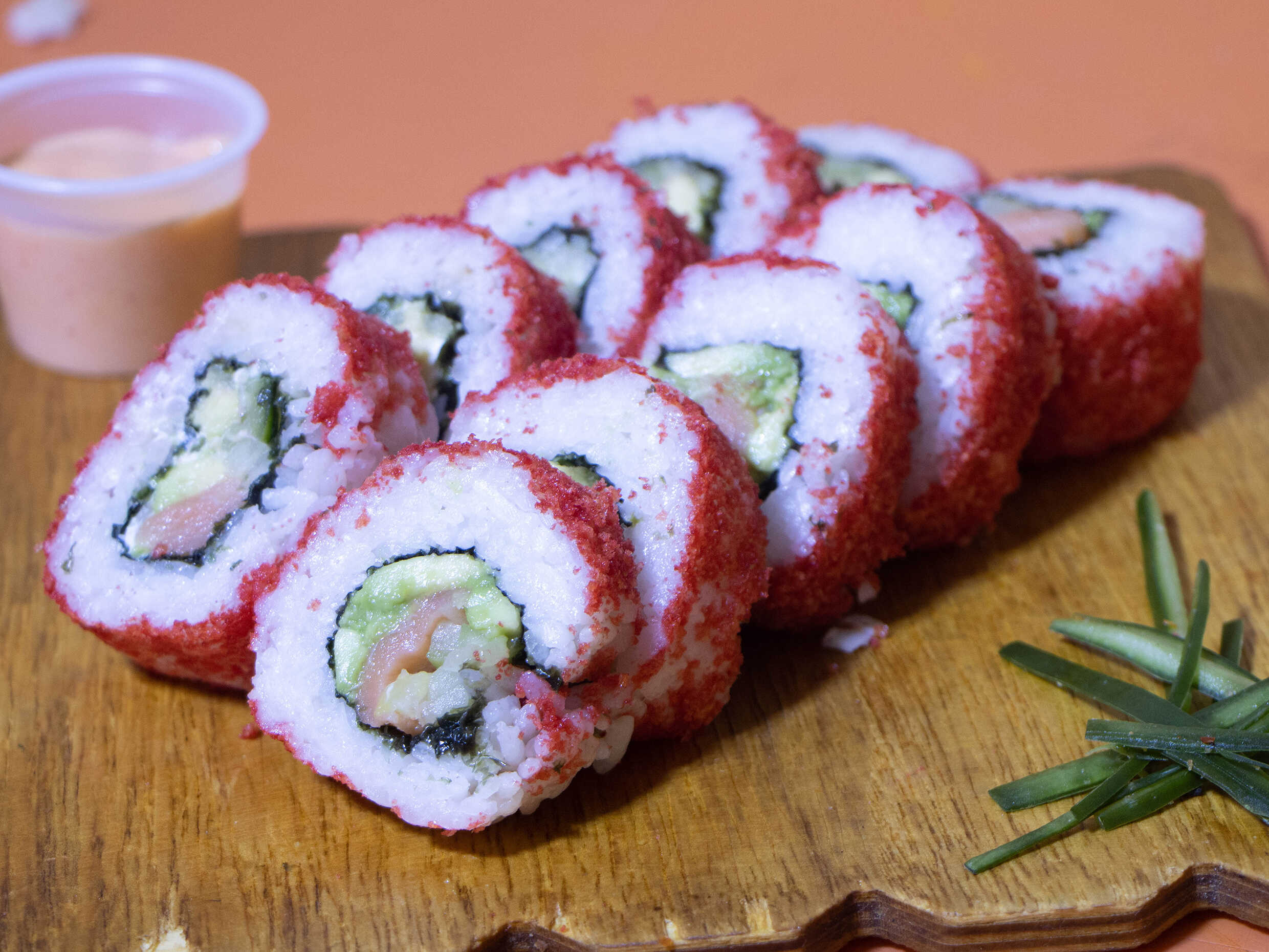 Fidadelfhia,aguacate,surimi,camarón,salmón,siracha