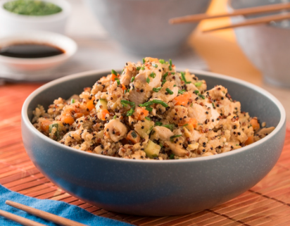 Arroz salteado en soya, zanahoria, cebollín,pollo