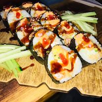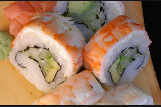 Camarón, salmón en salsa spicy, aguacate,pepino