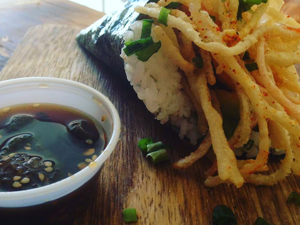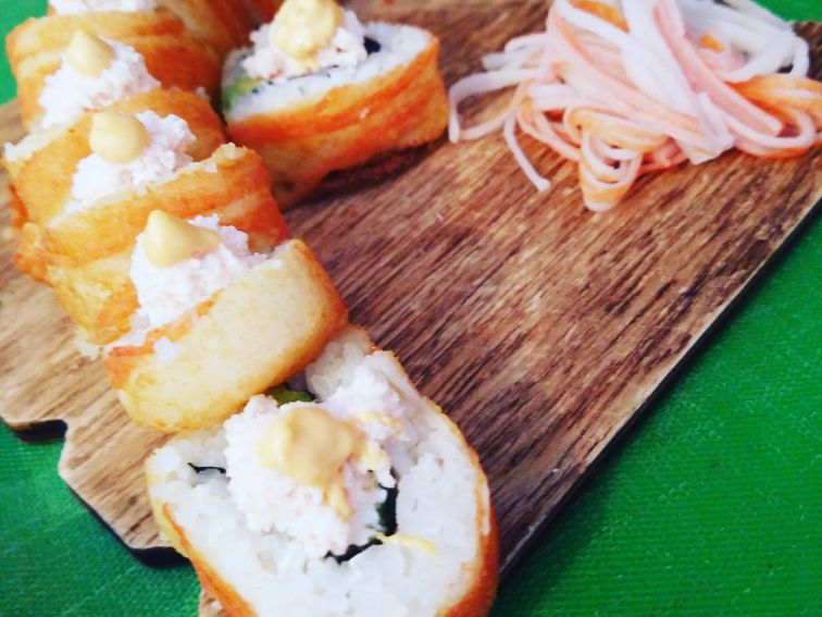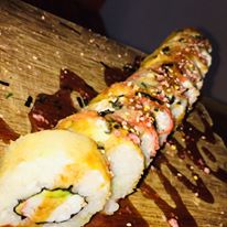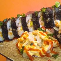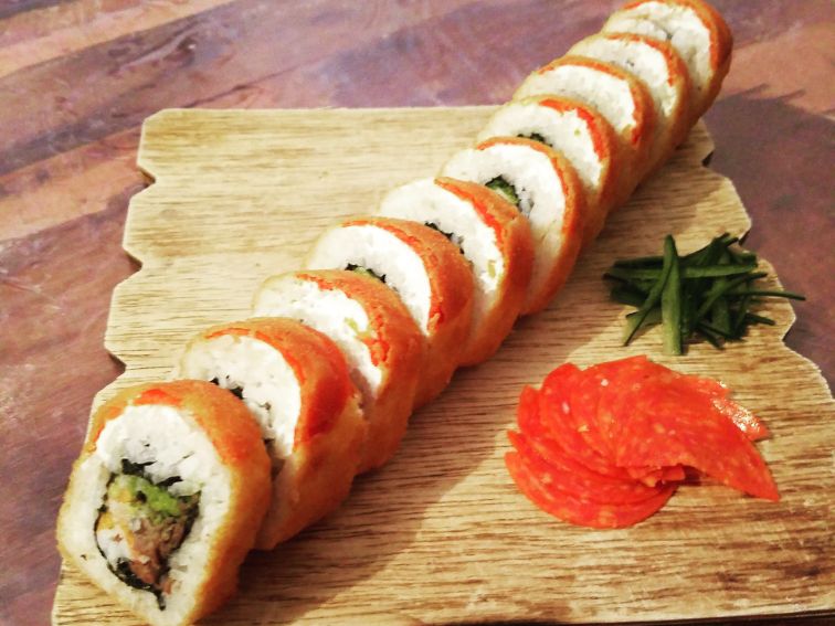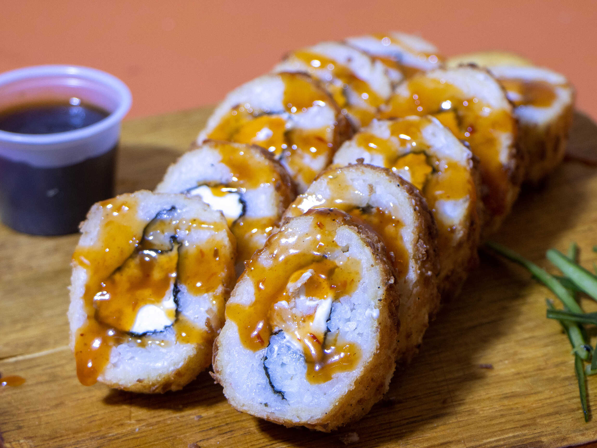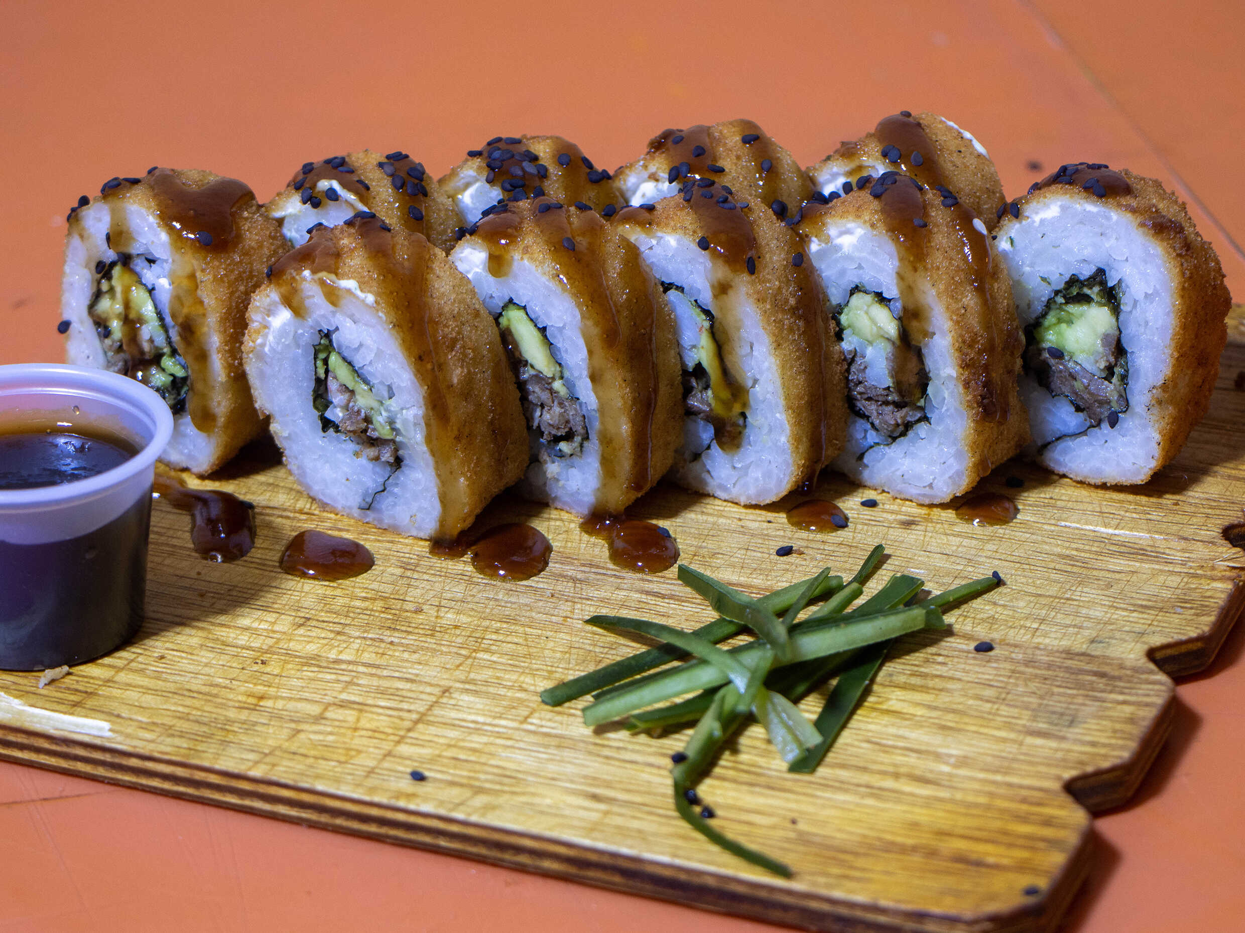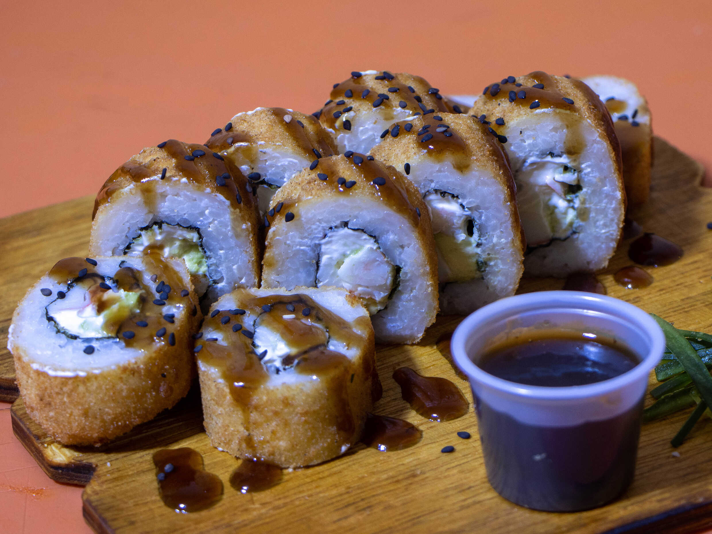 Camaron, queso crema, aguacate, surimi, pulpo, alga por fuera empanizados.