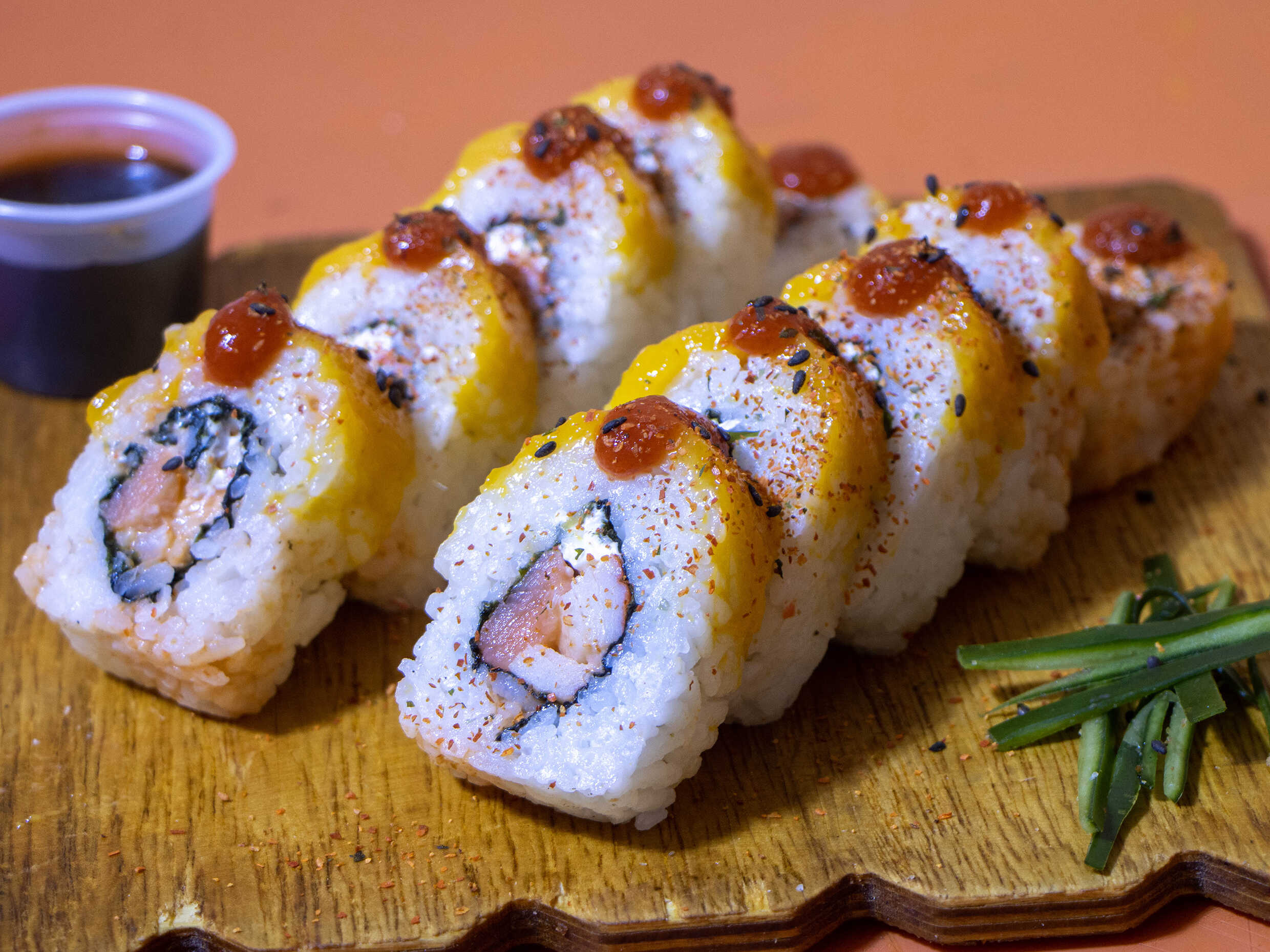 Mango, fidadelfhia,surimi,salmón,spicy, togarachi