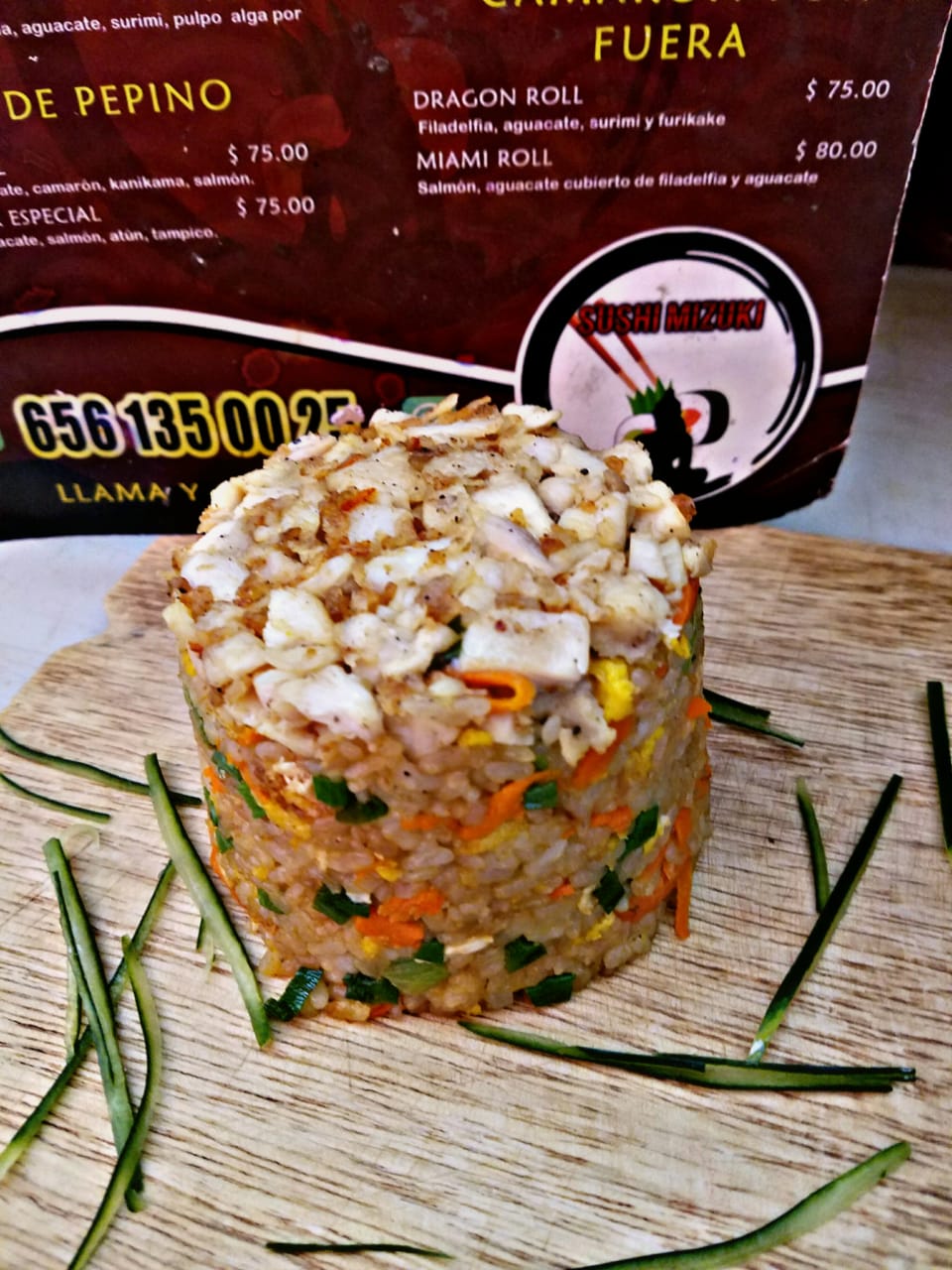 Arroz salteado en soya, zanahoria, cebollín,camarón,surimi,pulpo