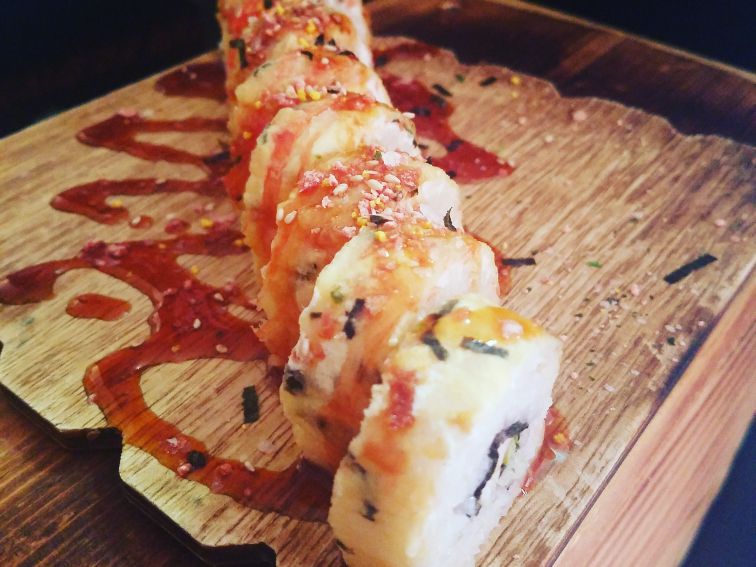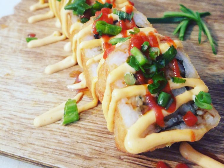 Aguacate, salmón frito,siracha preparada,furikake,togarachi