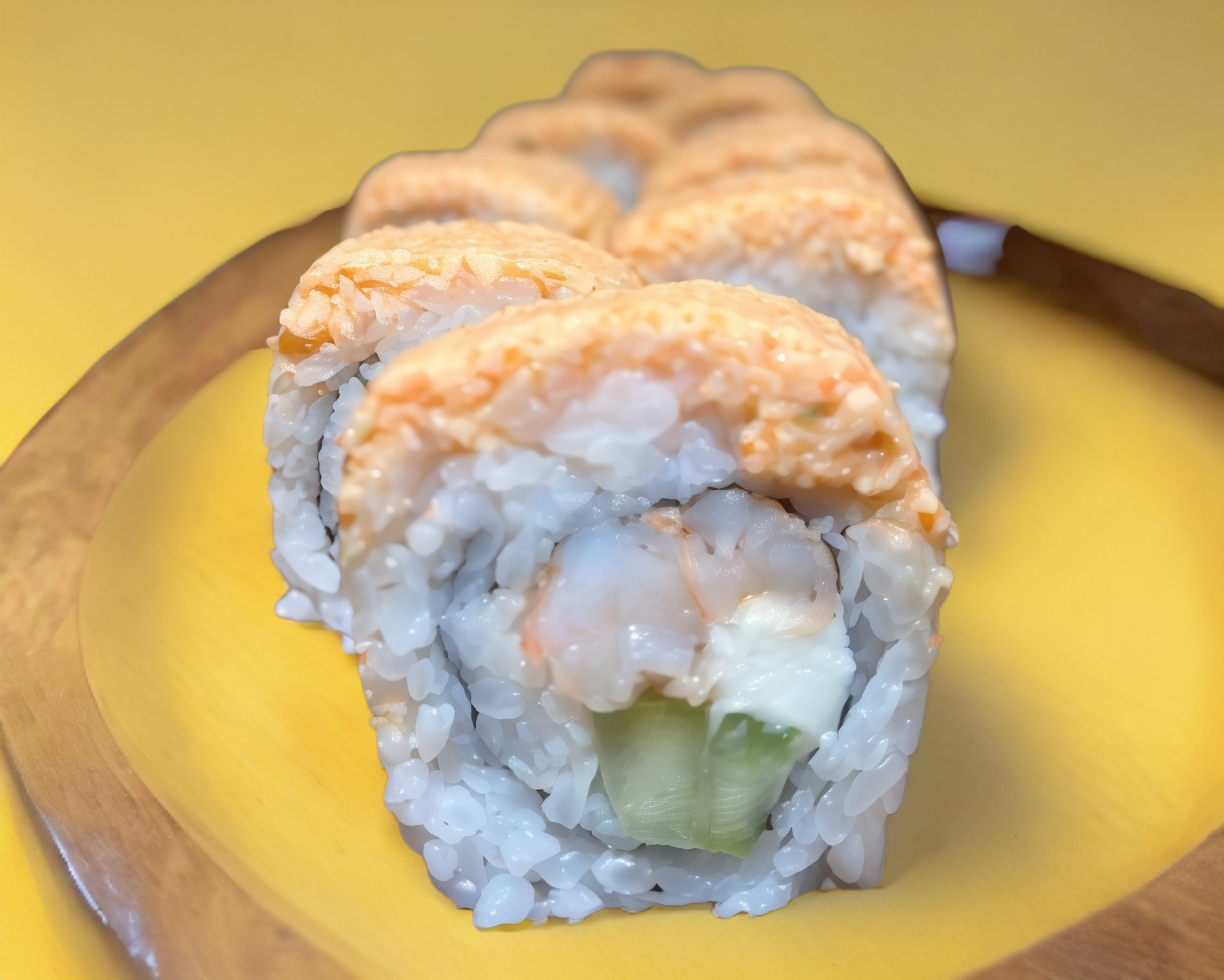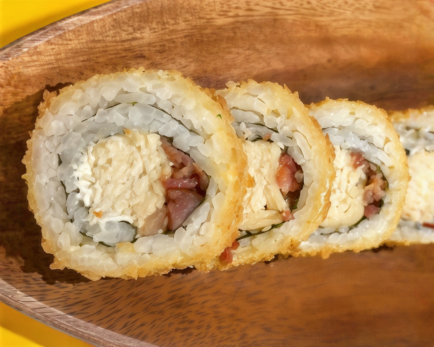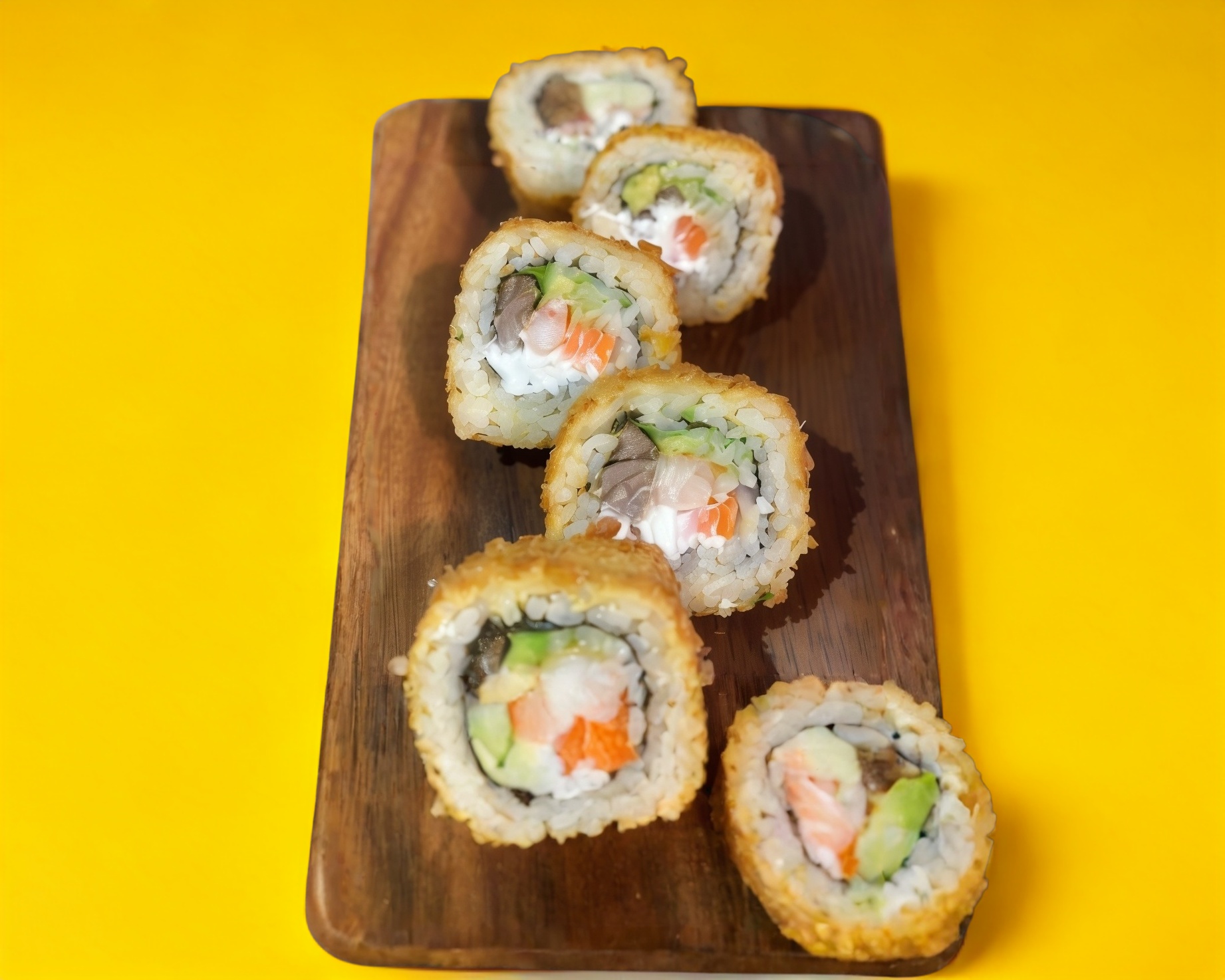 1 rollo de sushi de 10 pzs pechuga de pollo, tocino, queso crema y una salsa de tu elección.