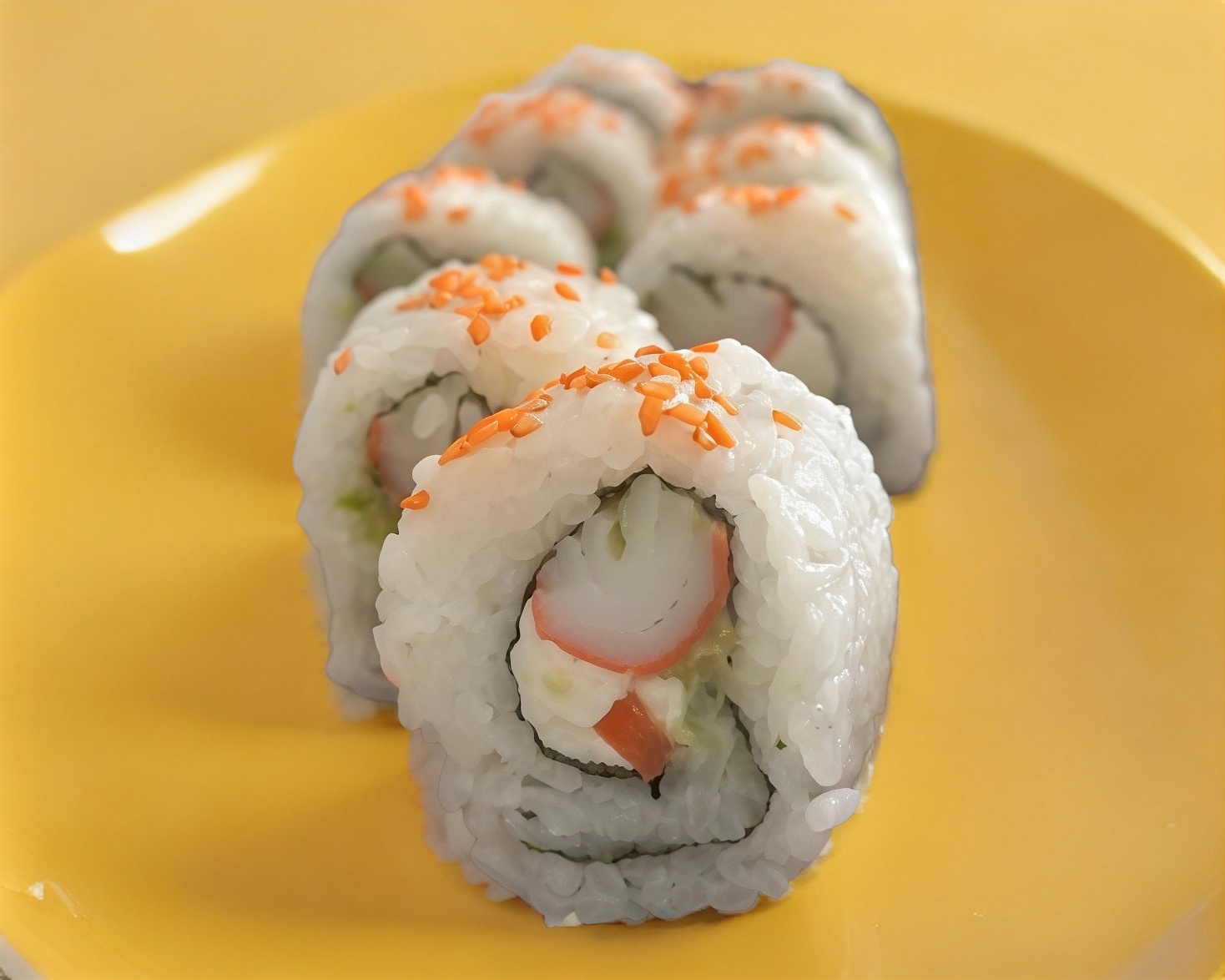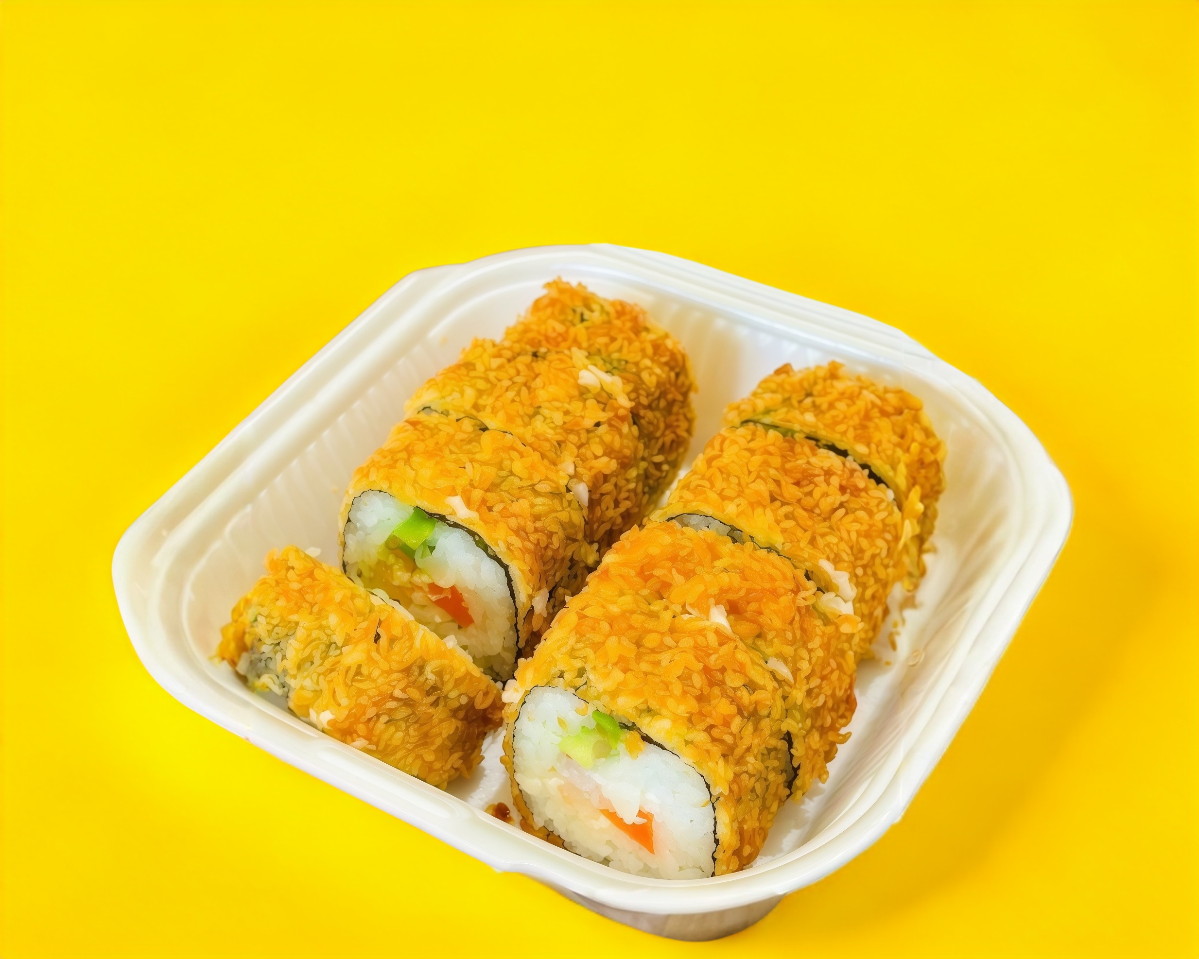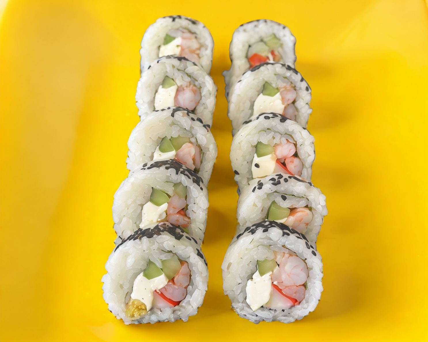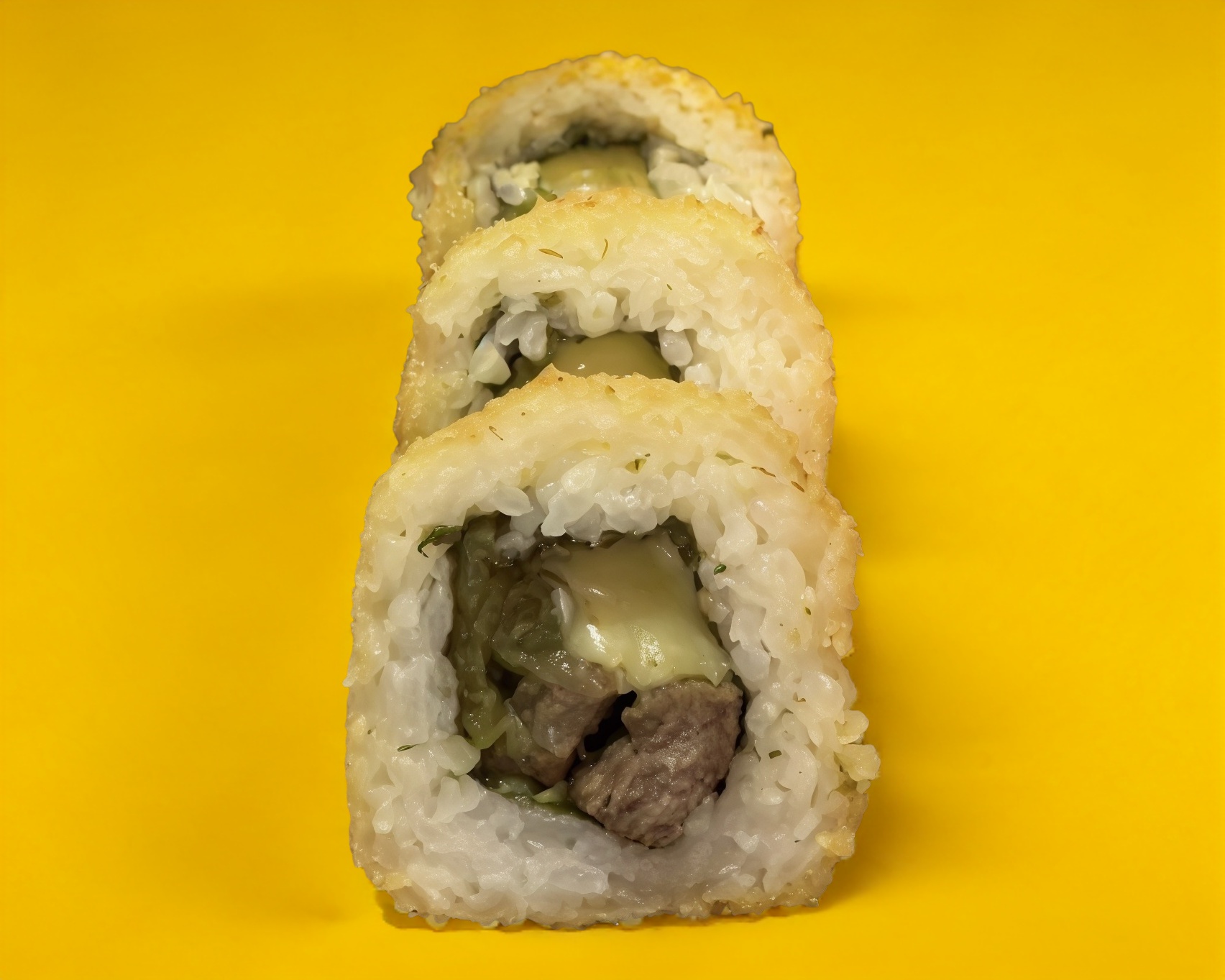 1 rollo de sushi de 10 pzs pechuga de pollo, tocino, queso crema y una salsa de tu elección.
