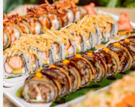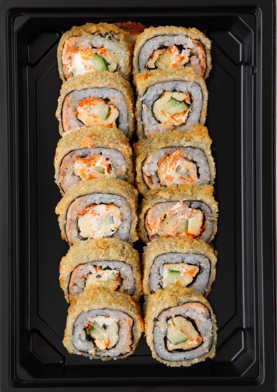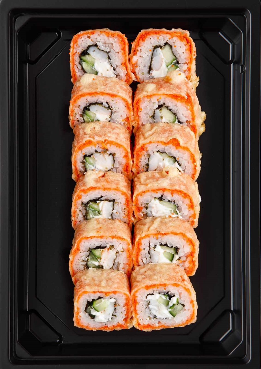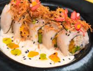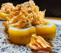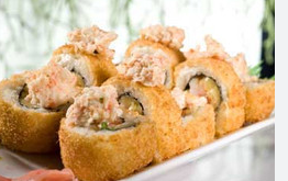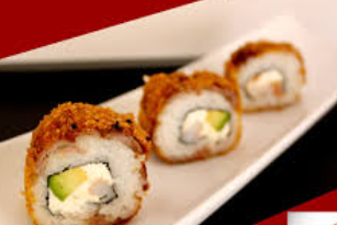 Por dentro camarón empanizado, queso philadelphia, aguacate, por fuera cubierto de crispy tempura.