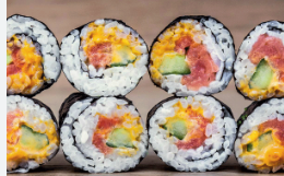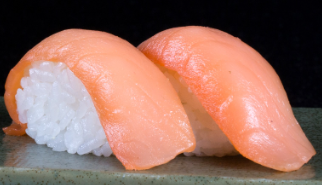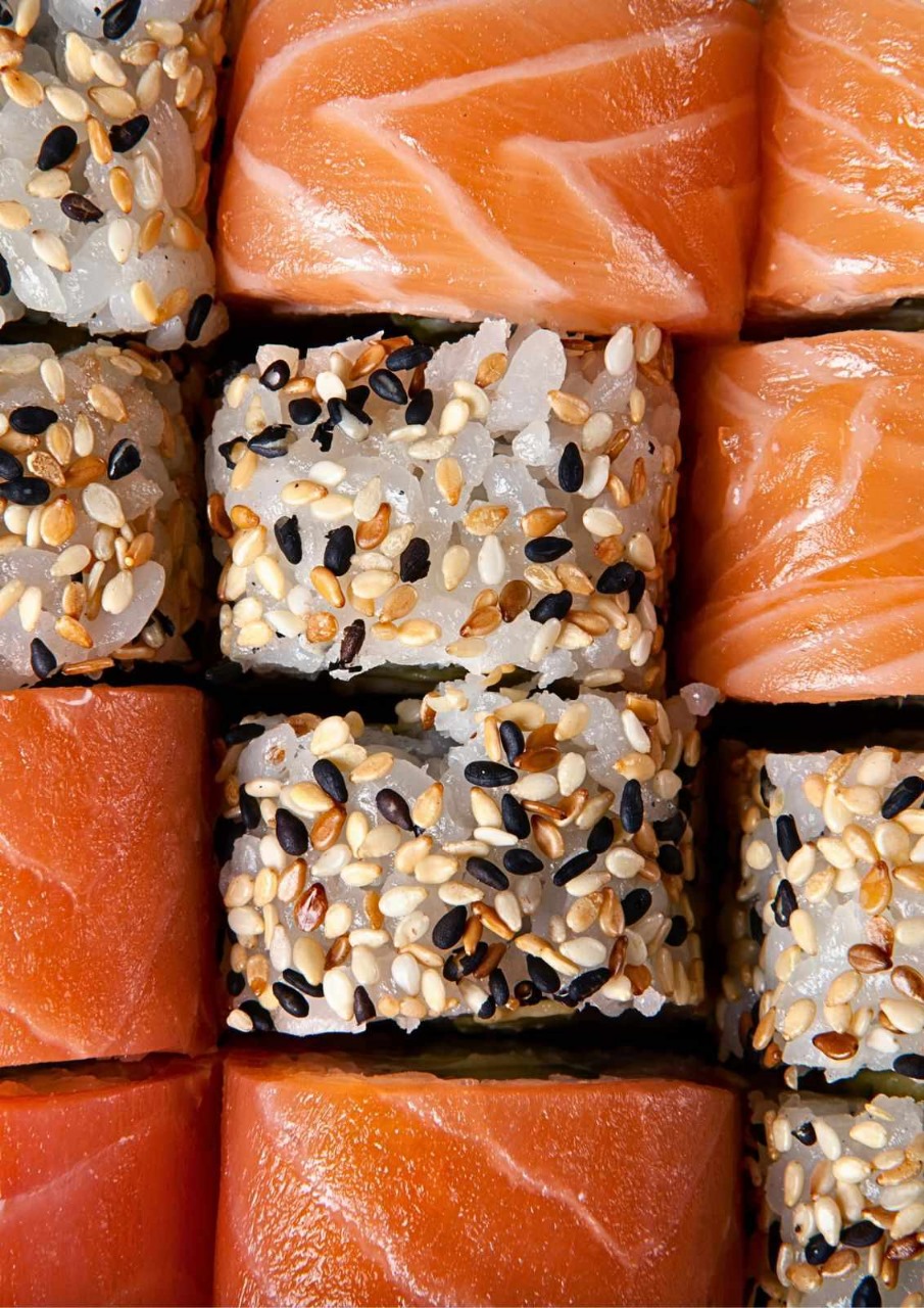 Por dentro salmon, aguacate, pepino, por fuera queso Philadelphia, Masago y ajonjolí.