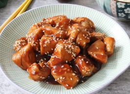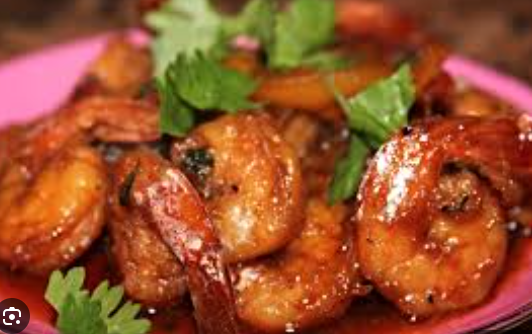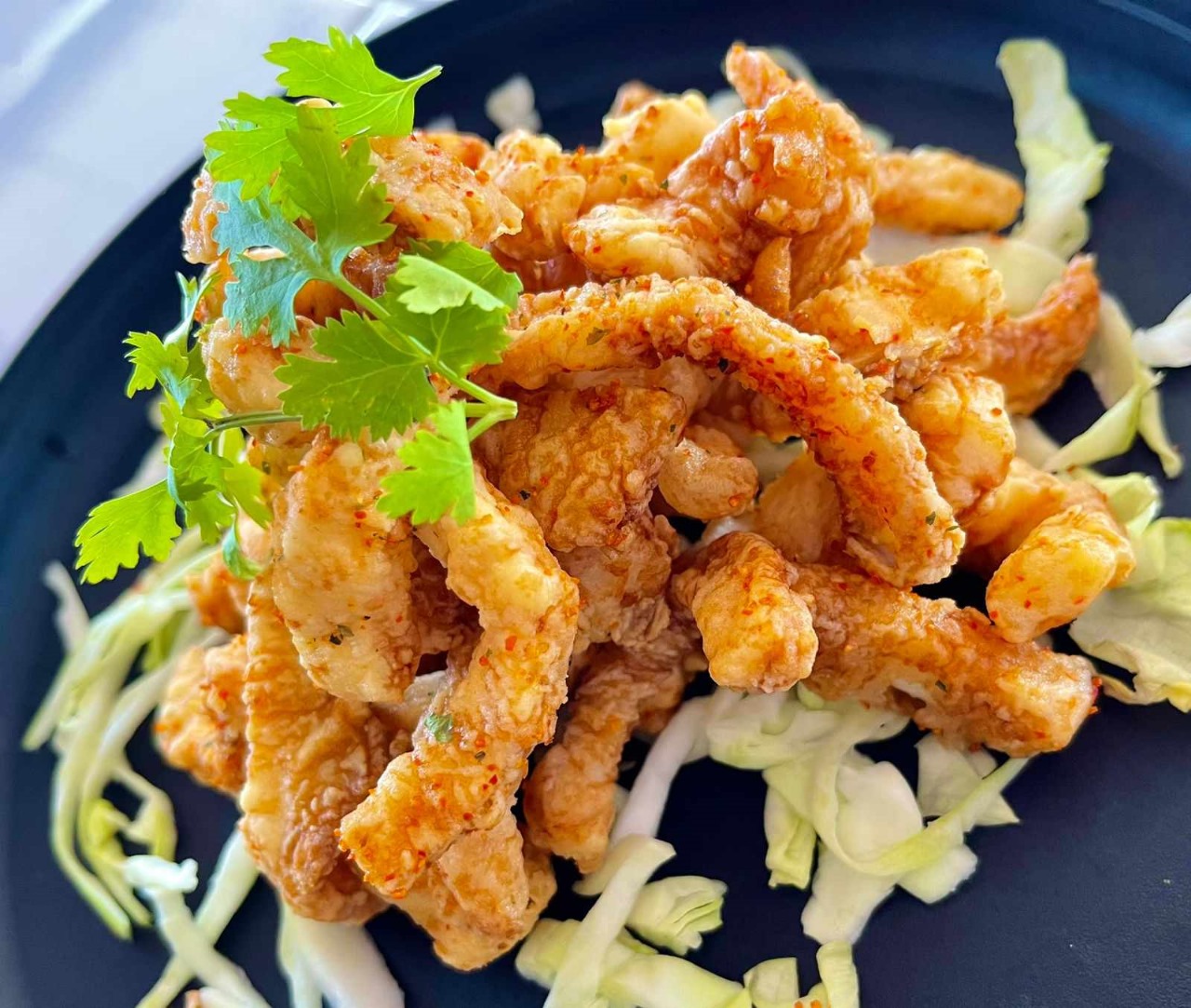 Por dentro camarón, chiles toreados, queso, por fuera finos cortes de pechuga de pollo bañado en tampico, salsa anguila y ajonjolí.