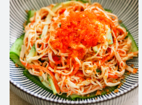 Por dentro pepino, cangrejo y aguacate, por fuera cubierto de ajonjolí negro.
