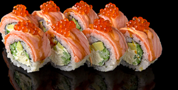 Por dentro camarón tempura, cangrejo, queso philadelphia, aguacate y por fuera cubierto de Salmon, masago, bañado en spicy mayo especial de la casa flameado al momento.