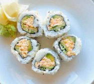 Por dentro camarón empanizado y aguacate, por fuera queso Philadelphia y pasta de cangrejo.