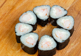 Por dentro camarón tempura, masago, pepino, aguacate, por fuera alga nori bañado en salsa anguila y ajonjolí.