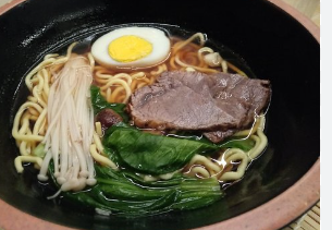 Noodles con finos cortes de rib eye, caldo base, 1/2 huevo y germen de soya.