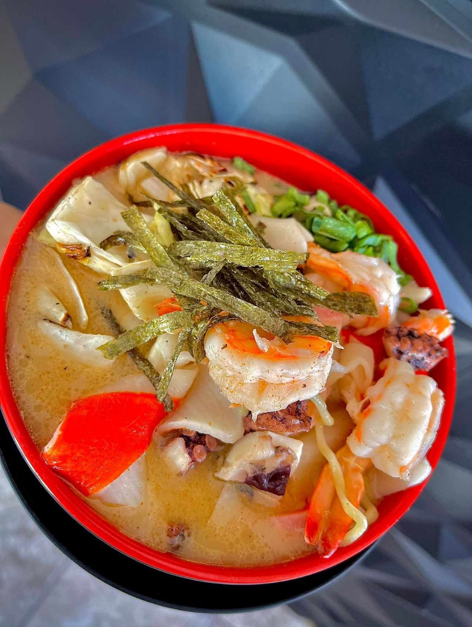 Noodles con mix de mariscos, rib eye y pollo, con caldo base, mix de verduras salteadas, 1/2 huevo marinado y un toque spicy.