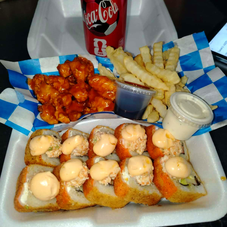 Por fuera: tiras de surimi. Por dentro : aguacate, Filadelfia, camarón. Bañado con salsa tartara y pasta Tampico
