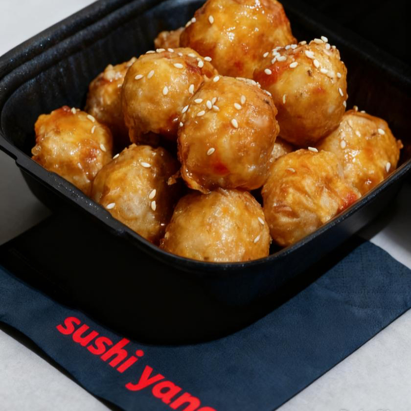 12 bolas de arroz capeadas rellenas de cangrejo y Philadelphia, bañadas en salsa de anguila y ajonjolí.