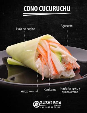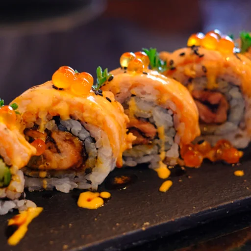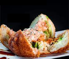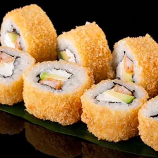 Empanizado en panko, camarón capeado por dentro, aguacate, cebollín, Philadelphia. Por fuera lleva: pasta de camarón masago, salsa vegas, salsa anguila, rodaja de jalapeño con un toque de sriracha.