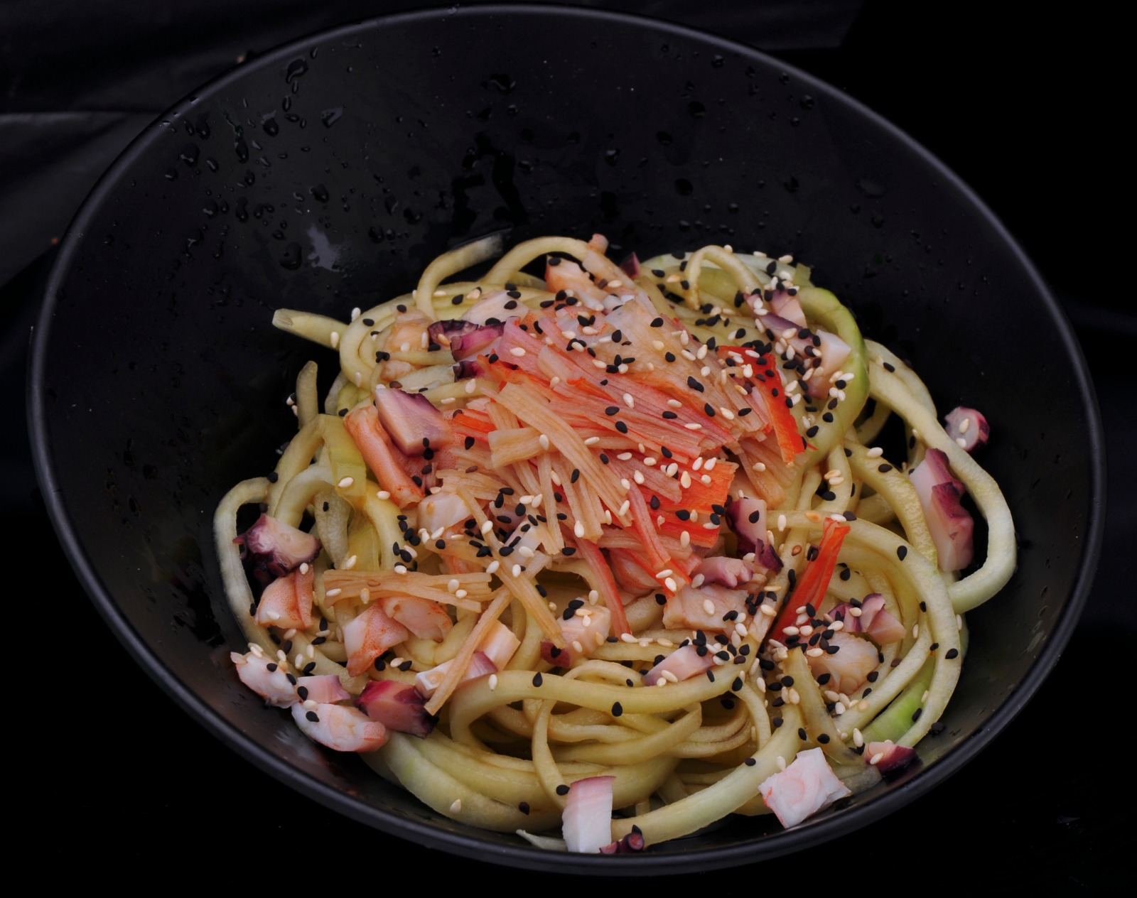 Camarón, wuakame, furikake, cebollín, salsa de casa y lechuga bok choy.
