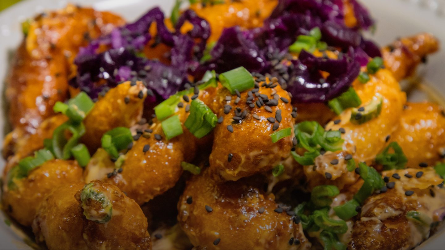 Camarón capeado, salsa spicy, cebollín y ajonjolí.