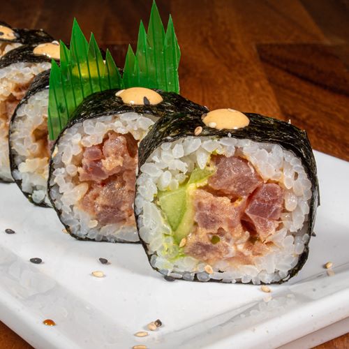 Aguacate, salmón, tártara, chipotle, sriracha, cebollín, pepino, masago.