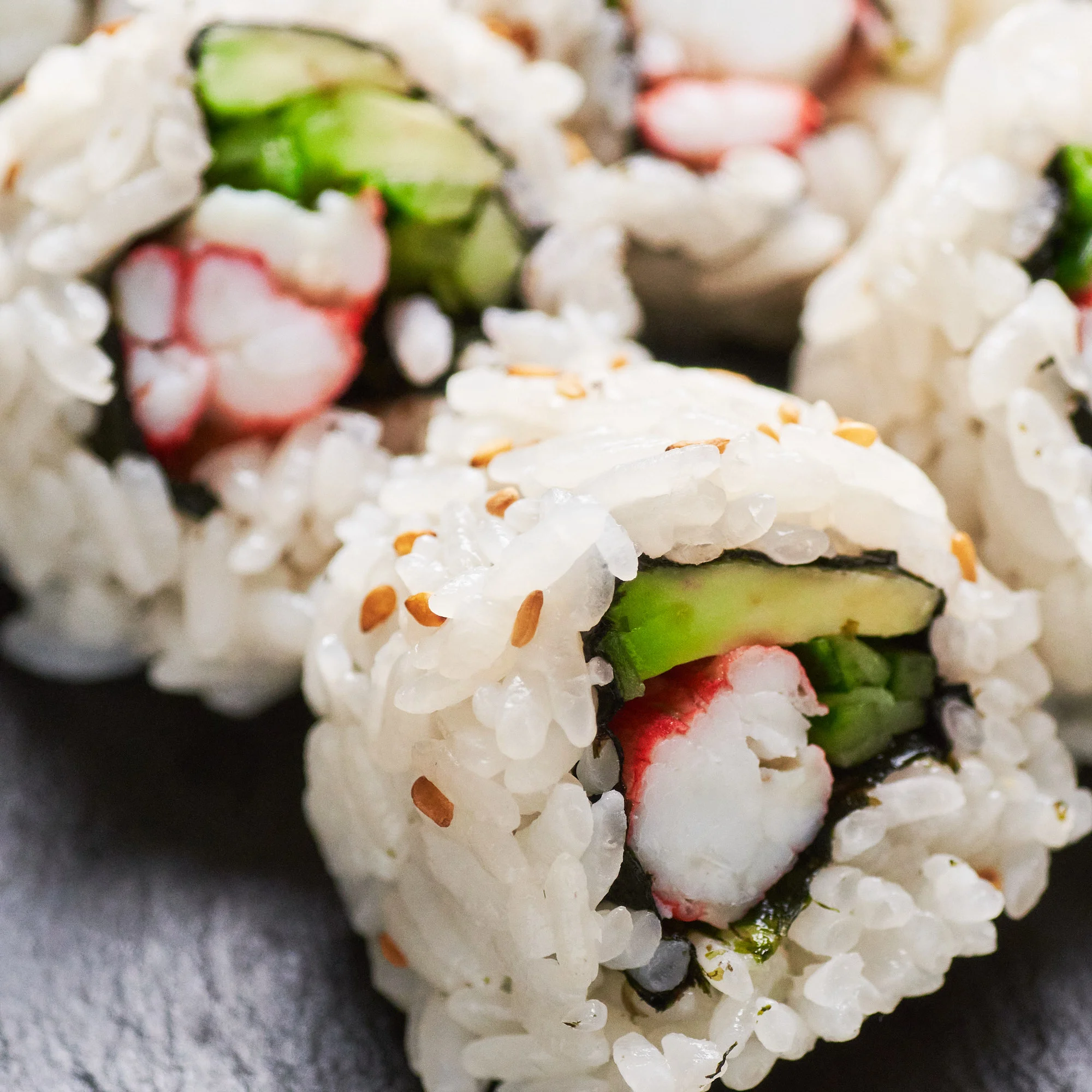 Kanikama preparado con masago, aguacate, pepino y ajonjolí por fuera. Alga por dentro.