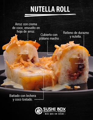 Arroz en crema de coco, envuelto en hoja de arroz, relleno de durazno y Nutella. Cubierto con plátano macho, bañado con Lechera y coco tostado.