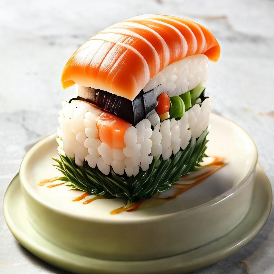 BOLA DE ARROZ CON SIRLOIN PECHUGA CAMARÓN AGUACATE PHILADELPHIA CON SALSA UNAGUI Y AJONJOLÍ NEGRO