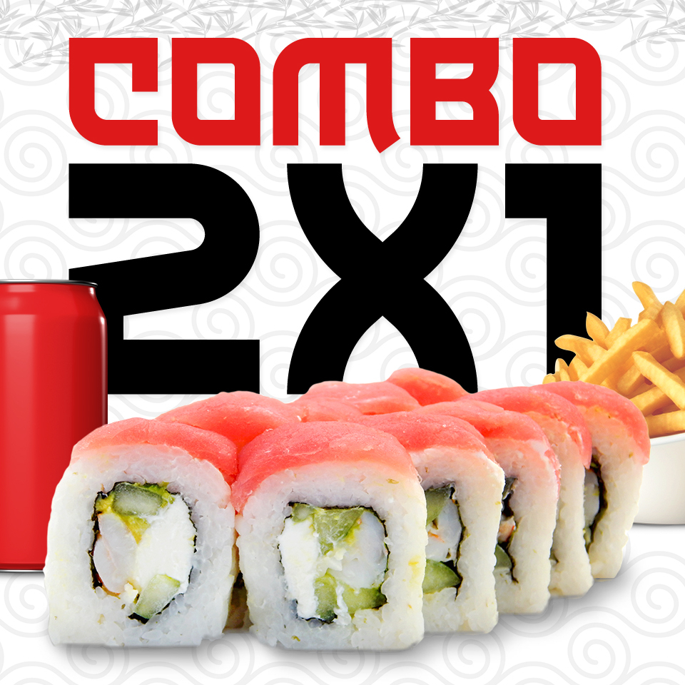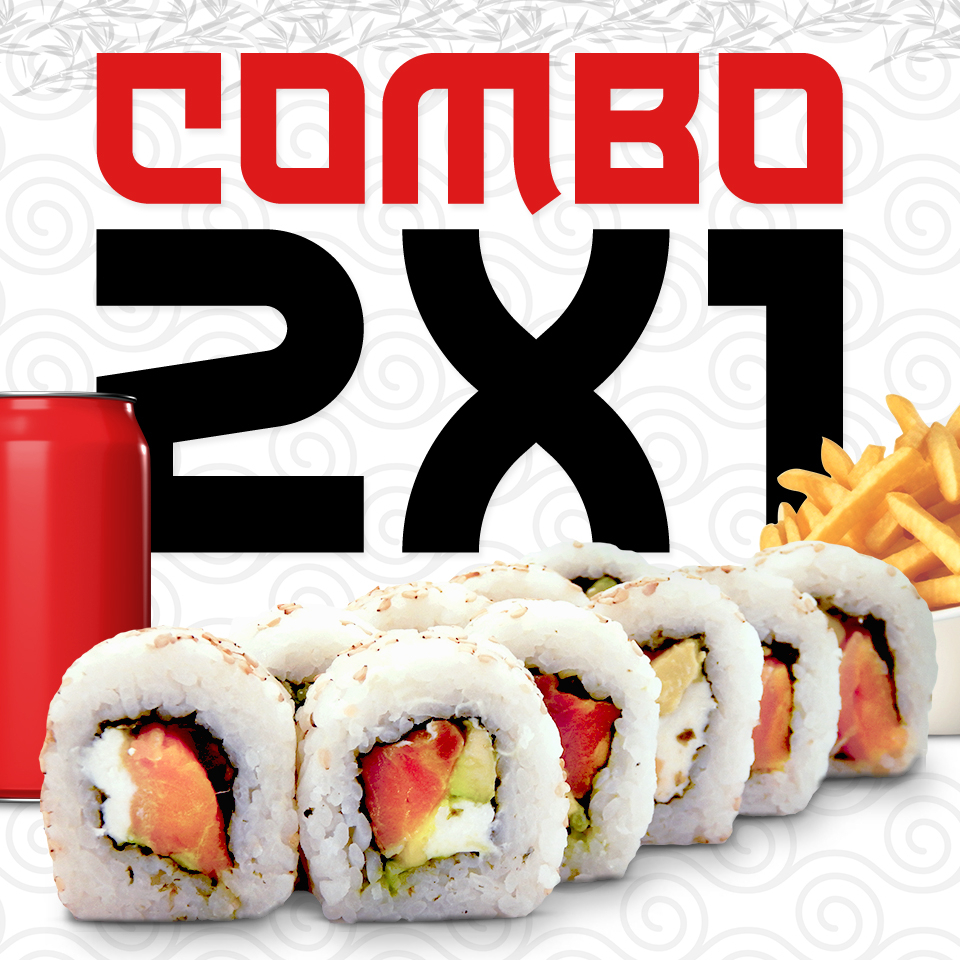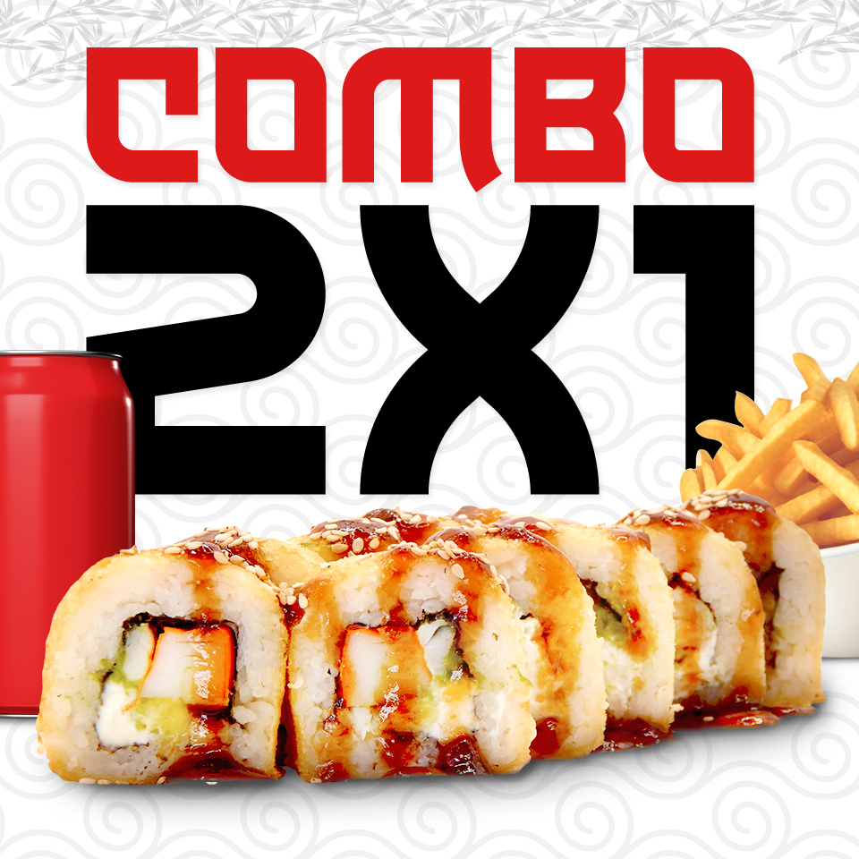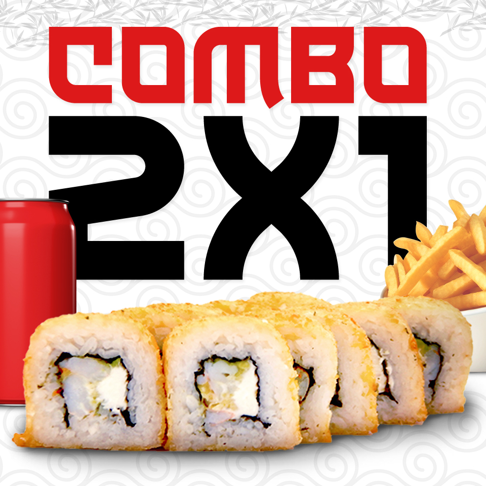 Combo de papas fritas, refresco y California Roll con un rollo extra de regalo.