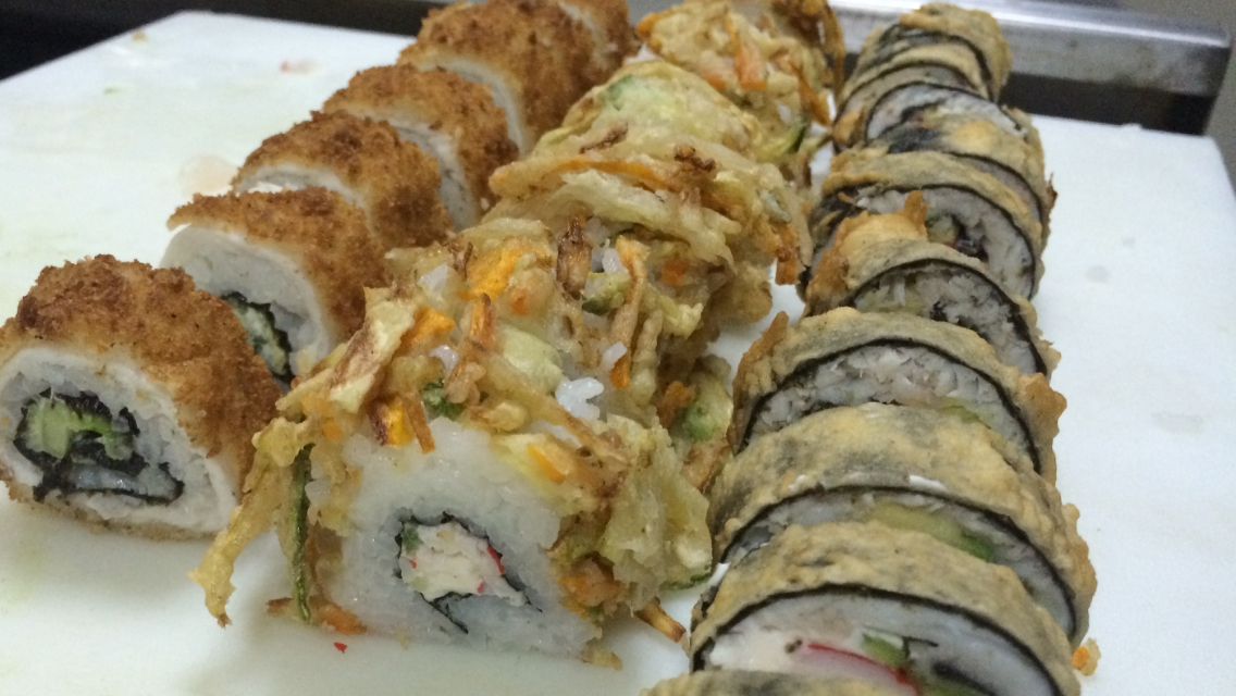 Salmón por fuera, camarón, cangrejo, Philadephia, aguacate, Tampico, siracha.