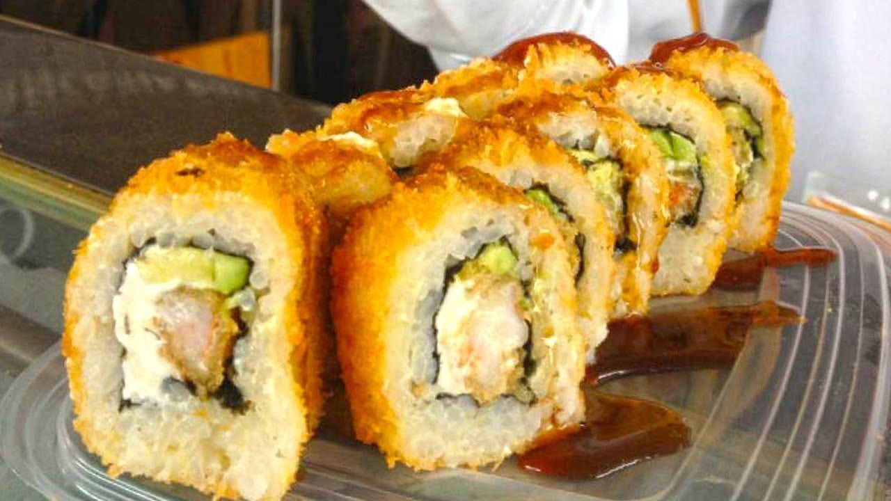 Aguacate, pepino, surimi, cubierto de queso Philadelphia, camarón y kanikama.