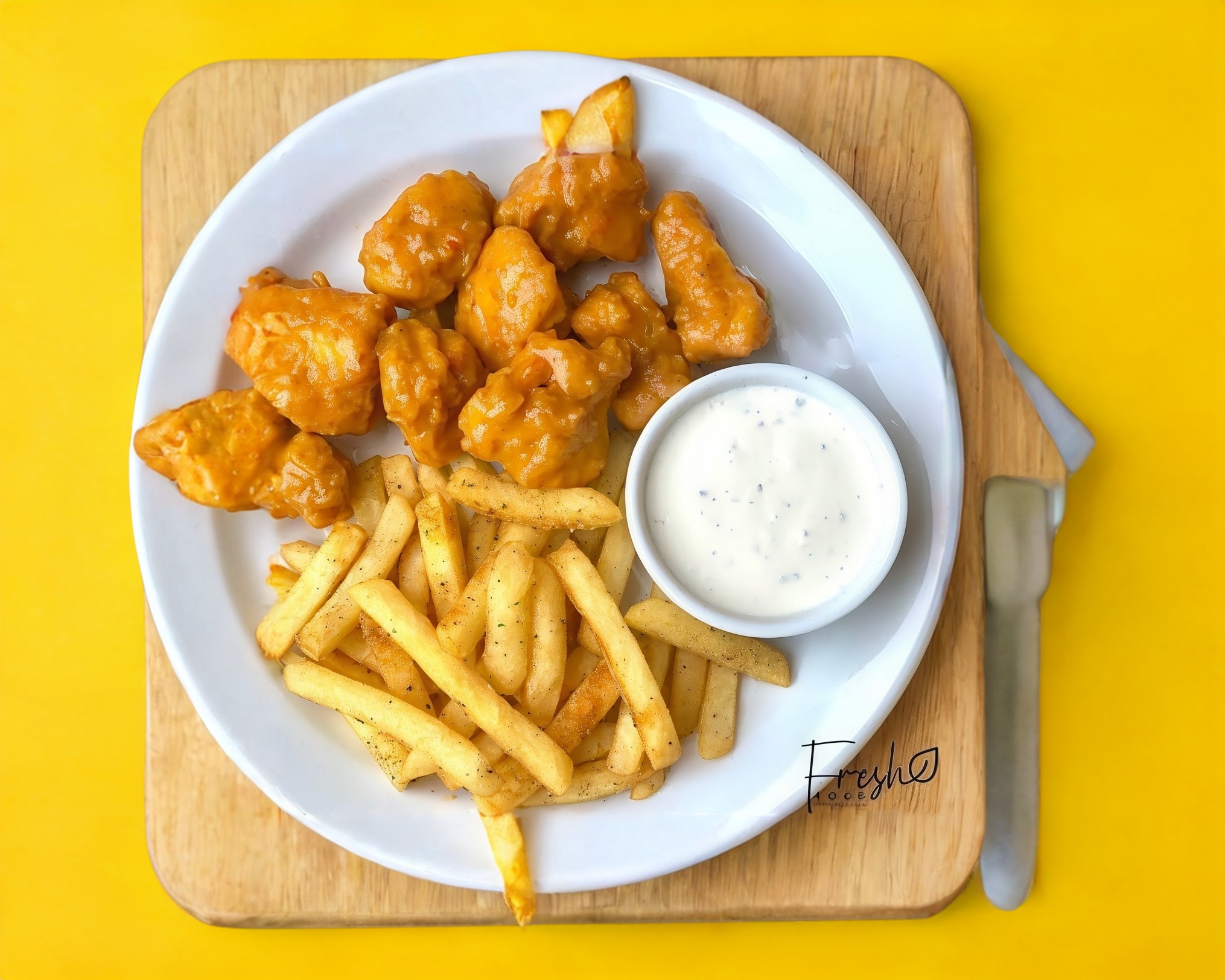 Pechugitas bañadas en salsa Búfalo con sus papas fritas, Ranch y Capsu