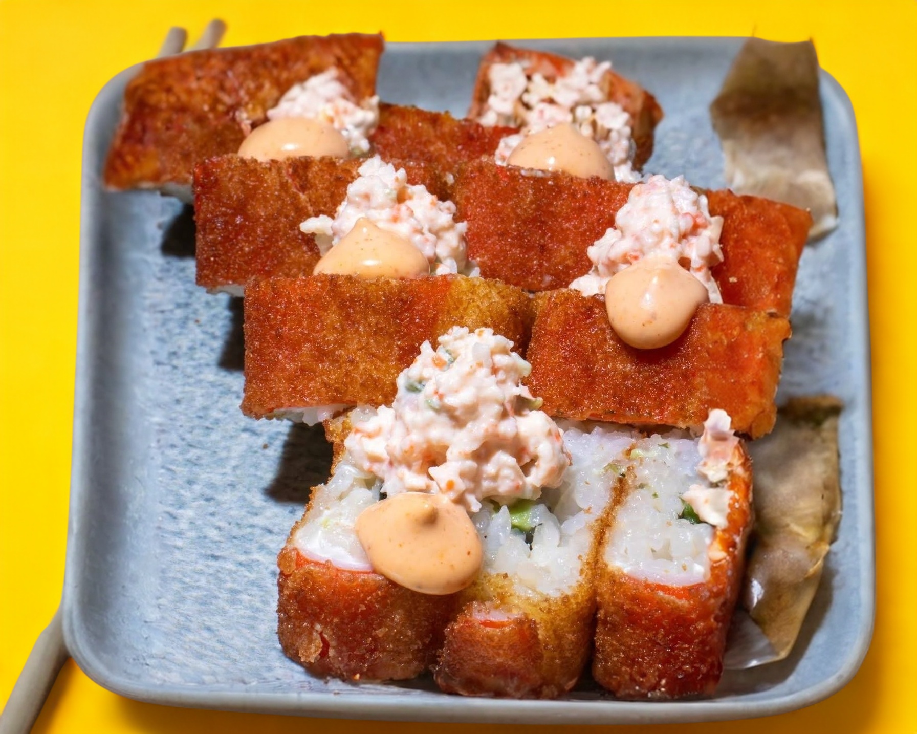 Por Fuera: Surimi y Queso Philadelphia. Por Dentro: Camarón -Aguacate y Queso Philadelphia . Por Encima:Pasta Tampico y Salsa Tártara.