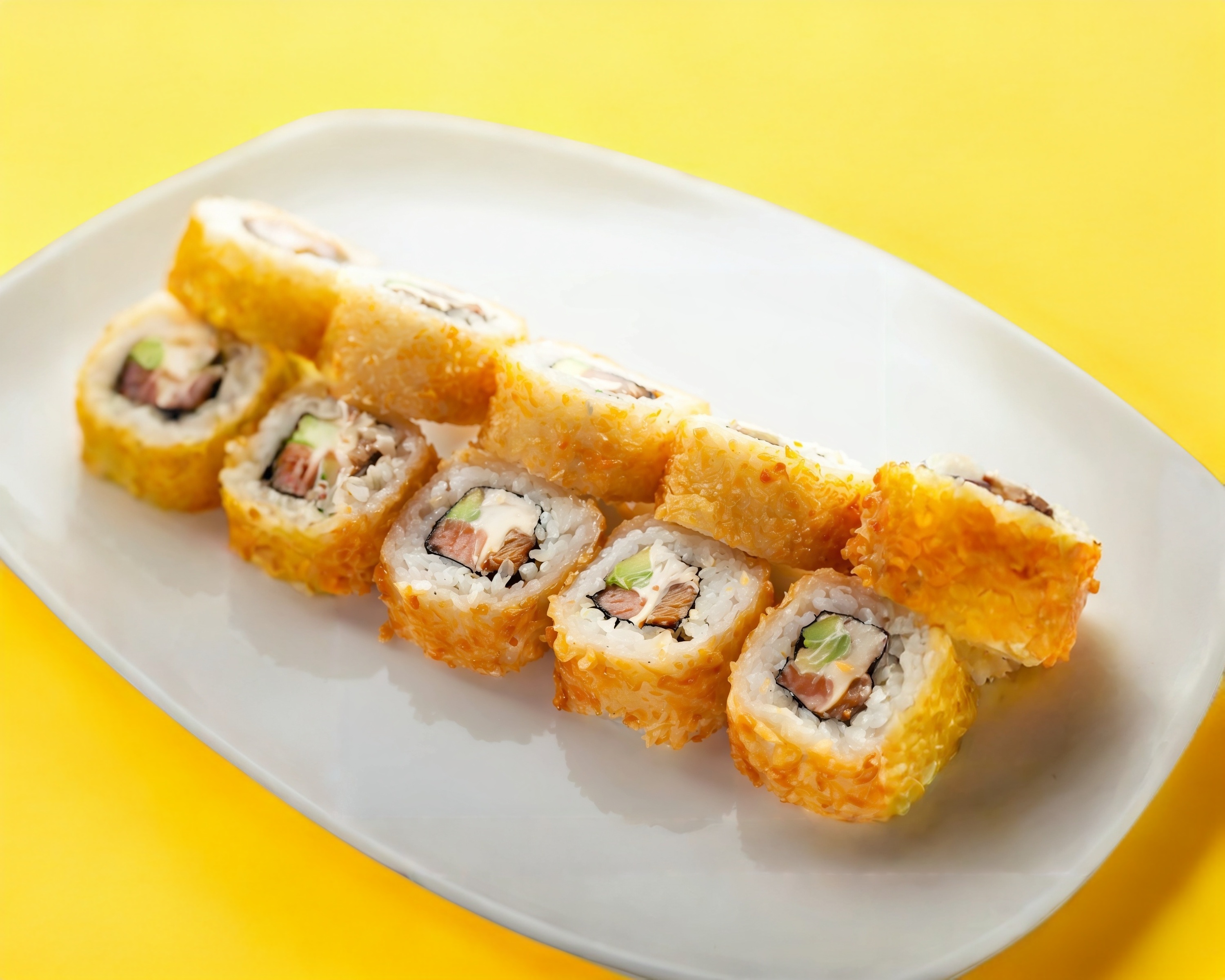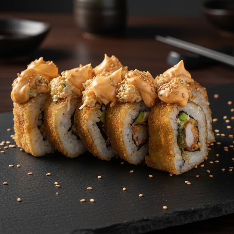 Por Dentro:Camarón Empanizado -Salmon - Toreados -Aguacate y Queso Philadelphia. Por Encima: Pasta Tampico- Salsa Tártara y Ajonjolí.