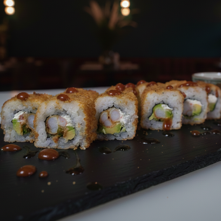 Por Fuera: Camarón Mariposa y Queso Philadelphia. Por Dentro: Salmón -Surimi y Aguacate. Por Encima: Salsa Tártara y Salsa Sriracha.