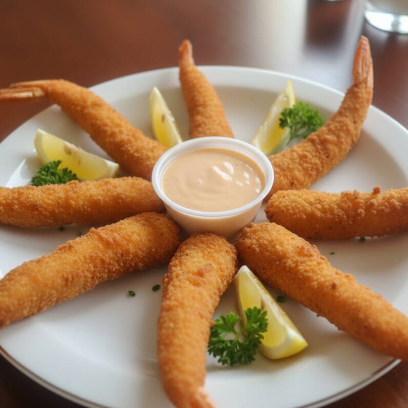 8 Camarones empanizados con 1 onza de Salsa Tártara